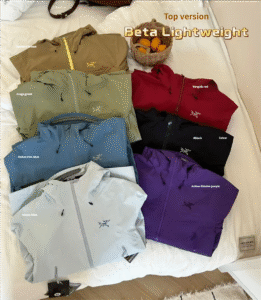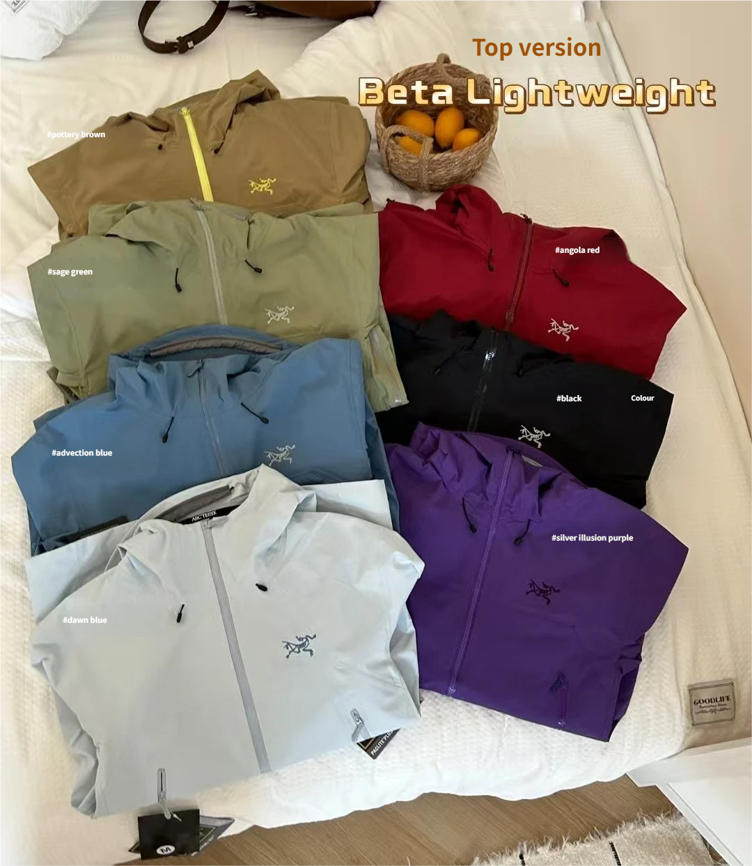 This image showcases multiple Arc’teryx Beta Lightweight jackets in colors like pottery brown, sage green, advection blue, dawn blue, angola red, black, and silver illusion purple. Labeled “Top version,” these jackets feature the brand’s signature logo and are displayed on a bed, highlighting their diverse color options and lightweight design.