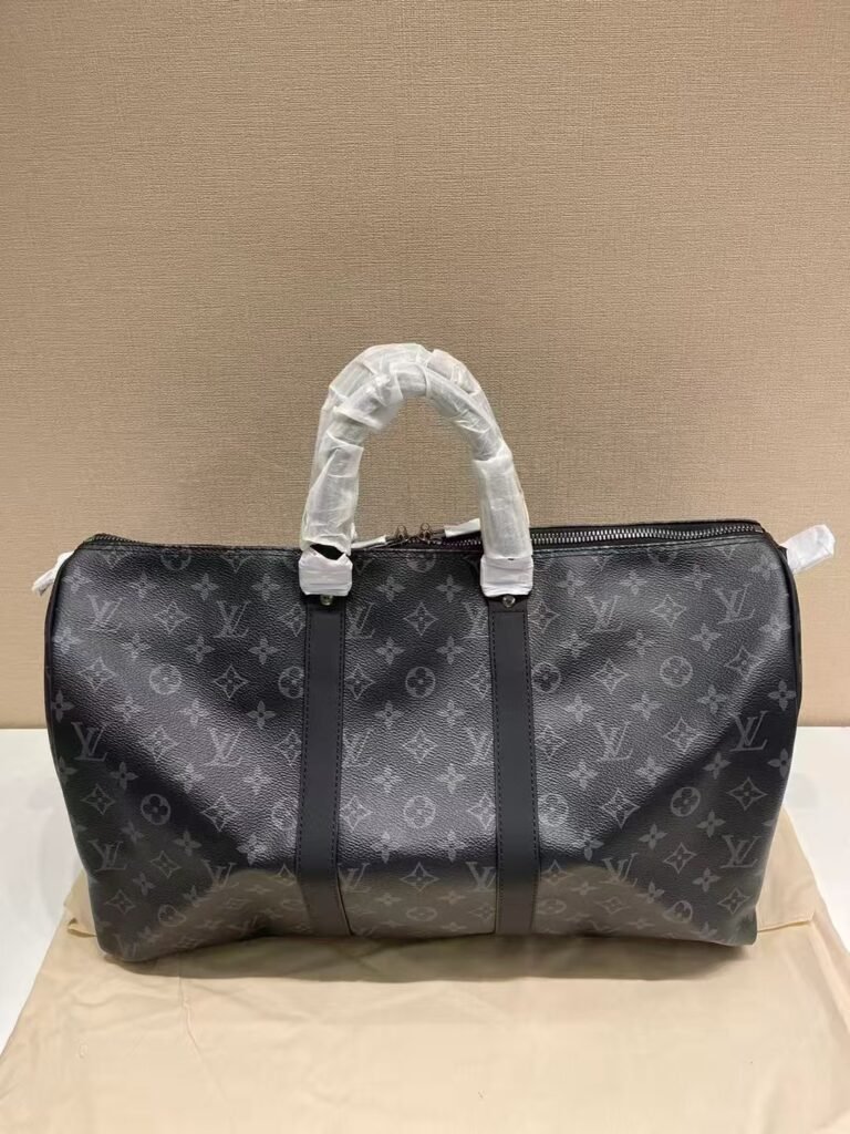 Louis Vuitton Travel bag This is a Louis Vuitton keepall bag in the iconic Monogram Eclipse canvas, featuring a sleek black and grey pattern. It has sturdy top handles (with protective wrapping), a zip closure, and reinforced leather strips, embodying luxury and functionality for travel or everyday use. Contact by email:qiling0251014@gmali.com