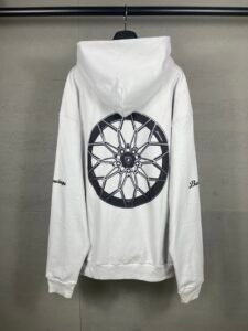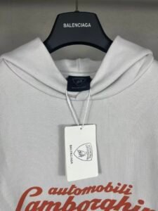 - Design & Branding: A white pullover hoodie (relaxed fit) featuring full-print details: Lamborghini’s “automobili Lamborghini” lettering, a graphic of the Lamborghini Temerario car, and partial “Balenciaga” logos on the sleeves.