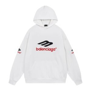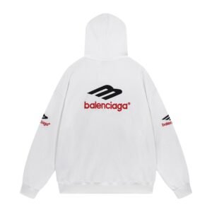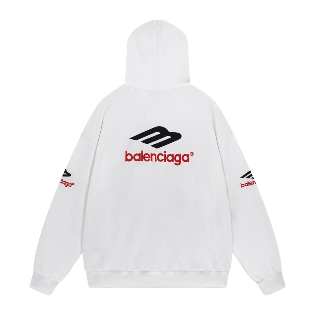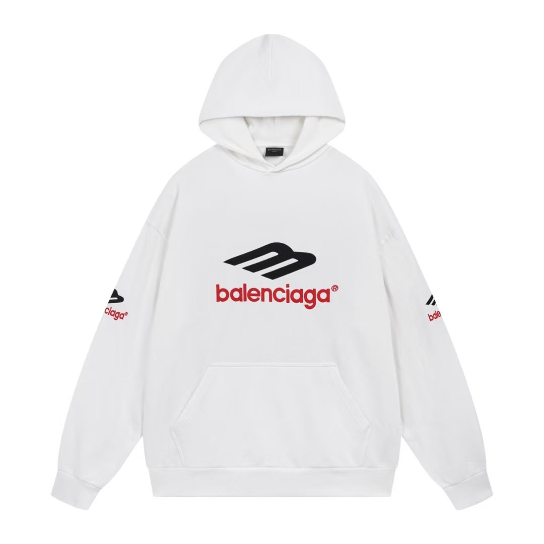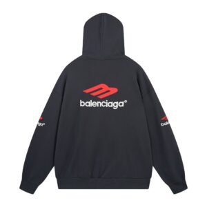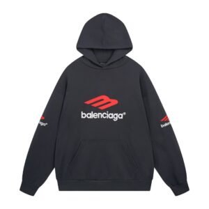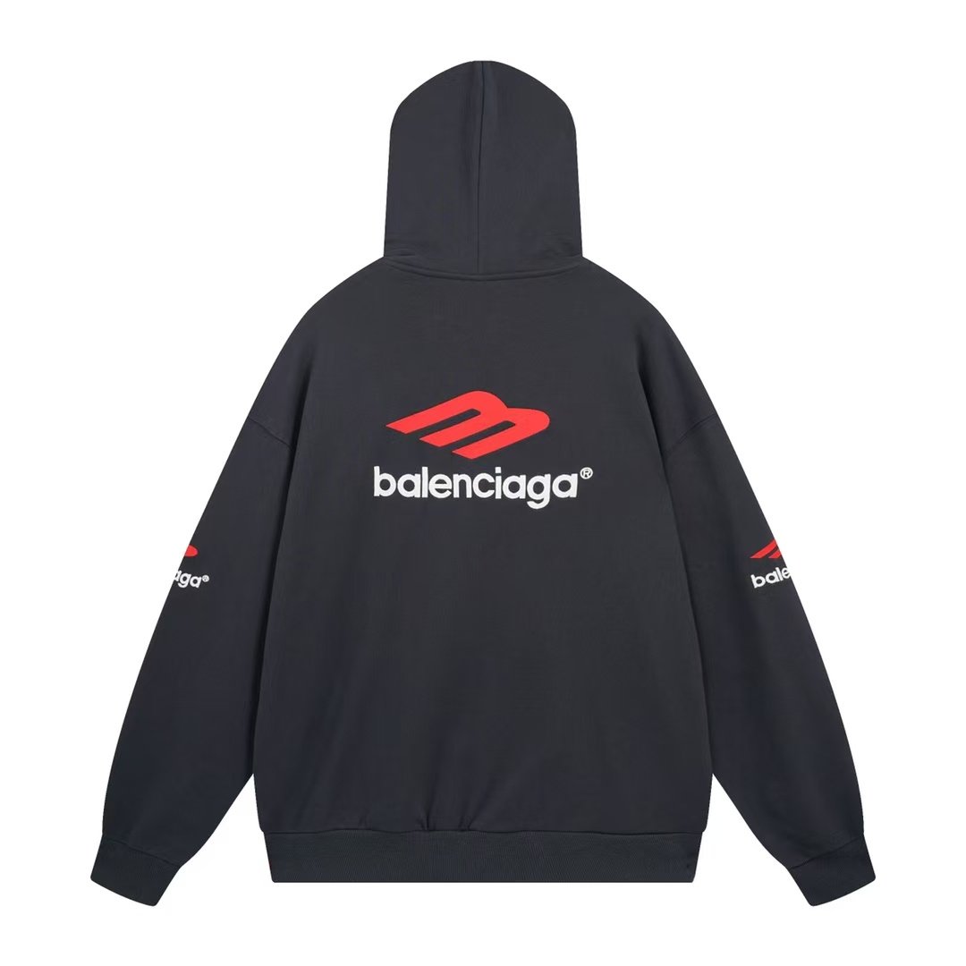Balenciaga's 2024 new hoodie with large logo embroidery Design: Oversized black hoodie with a drawstring hood and kangaroo pocket, featuring a relaxed fit.Branding: Bold red “3B” icon + white “balenciaga” lettering (embroidered on the chest), plus matching logo details on both sleeves.Style: A striking high-street casual piece ideal for bold, branded daily outfits. Contact by email:qiling0251014@gmali.com
