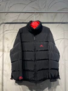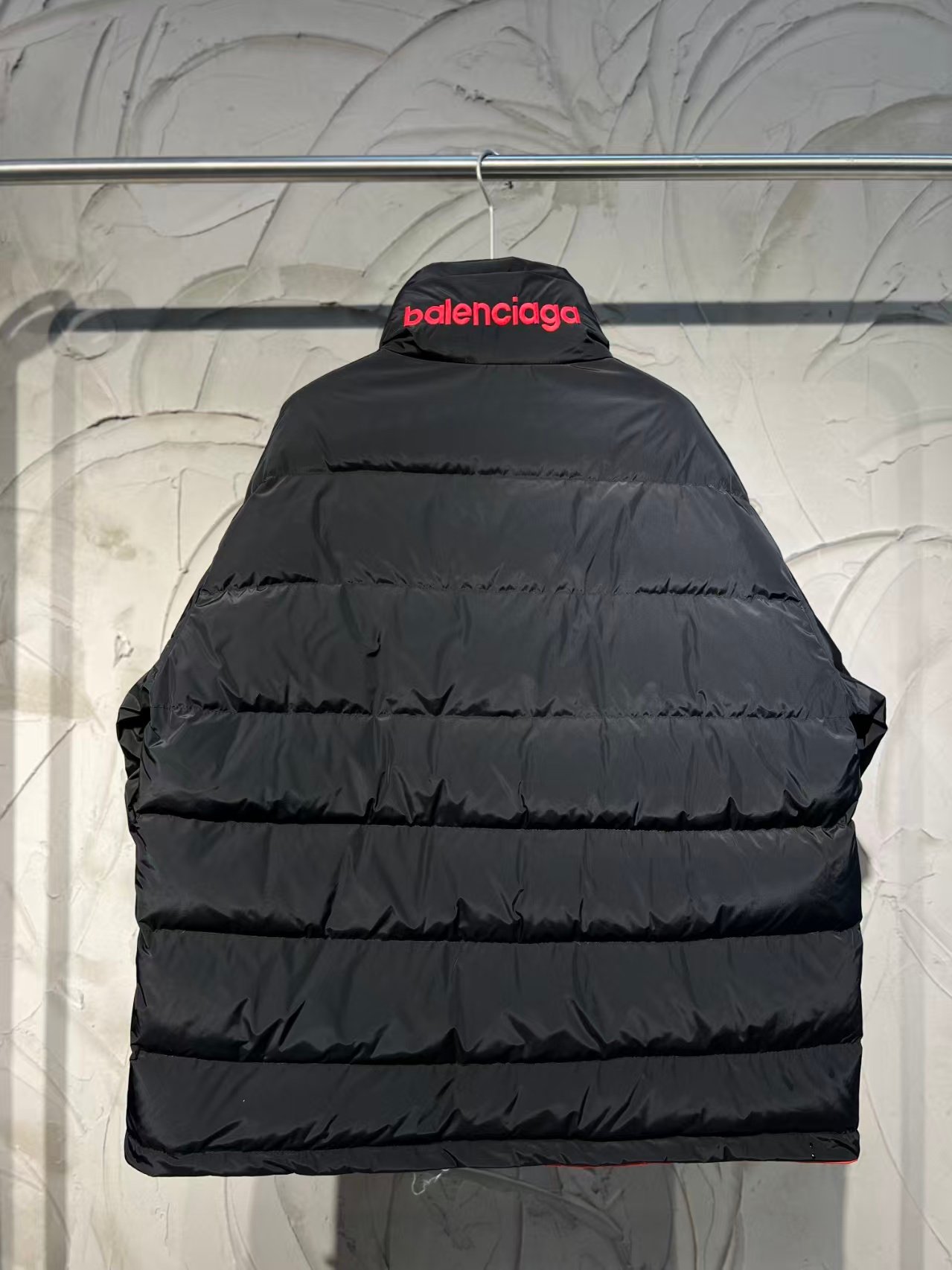 Design: Oversized black cocoon-silhouette puffer (zip-front, stand collar) with a reversible two-wear design, lightweight padded fabric, and elasticated cuffs.