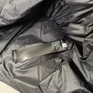 - Design & Style: A short, oversized “bread-style” puffer coat in black, featuring a stand-up collar, double-zip closure, and adjustable drawcords at the hem. It has vertical zippered side pockets for practicality.