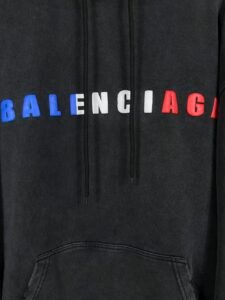- Branding: Features a bold “BALENCIAGA” logo in 发泡 (foam) print, colored in blue, white and red.