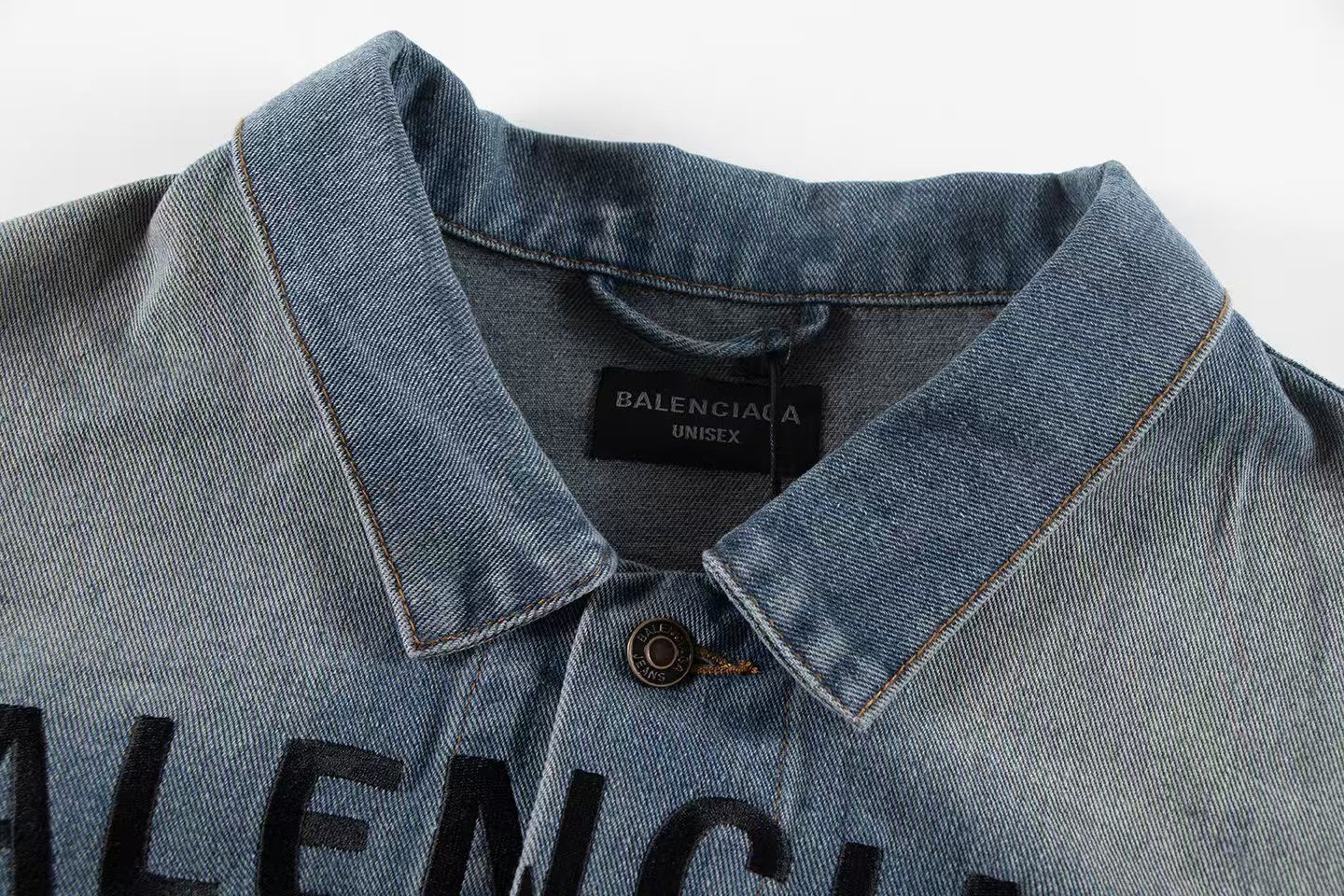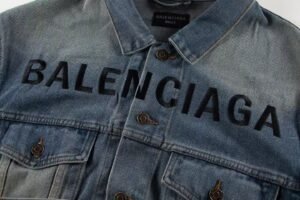 Balenciaga's denim jacket with chest embroidery Design: Oversized light-wash denim jacket (button-front, shirt collar) with a faded, distressed finish, plus classic patch pockets.Branding: Features bold black “BALENCIAGA” lettering (embroidered prominently across the chest).Style: A timeless luxury streetwear piece ideal for casual, layered daily outfits Contact by email:qiling0251014@gmali.com