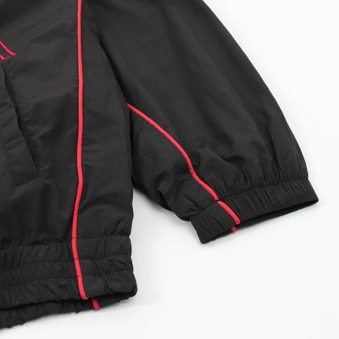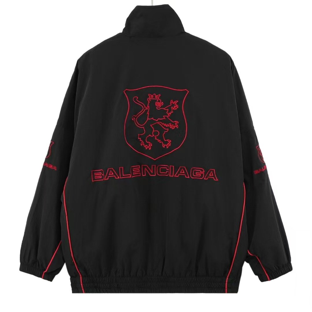 Balenciaga's embroidered zip-up jacket This is Balenciaga’s embroidered zip-up jacket:Design: Oversized black jacket with a stand-up collar, full zip, and elasticated cuffs/hem. It features red contrast piping along the sides.Branding: Bold red-embroidered details—including a shielded lion crest (chest) and “BALENCIAGA” lettering, plus partial logos on the sleeves.Style: A statement streetwear outerwear piece ideal for edgy casual outfits. Contact by email:qiling0251014@gmali.com