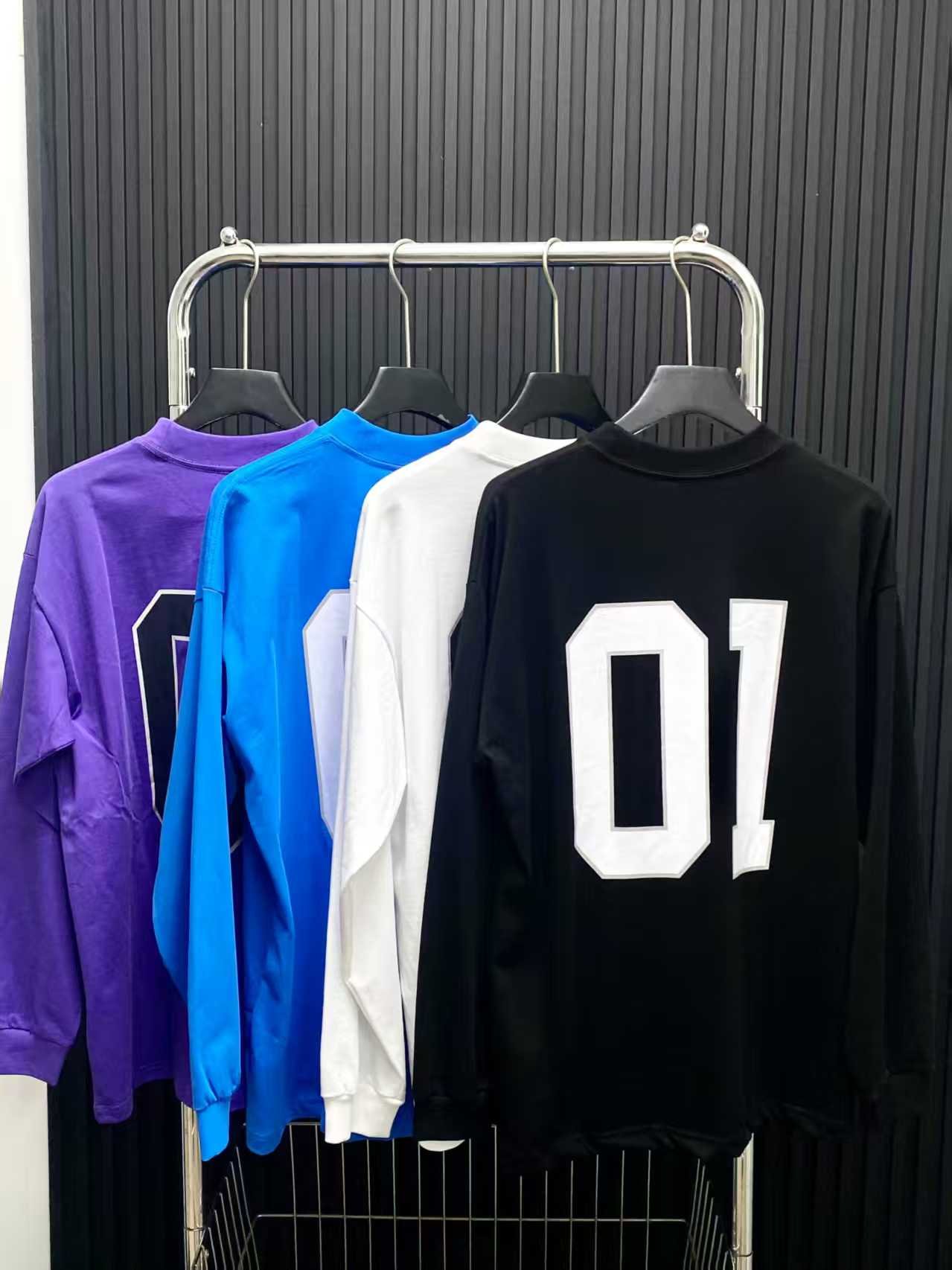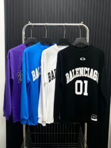 This is Balenciaga’s SS25 oversized crewneck long-sleeve T-shirt (available in multiple colors: purple, blue, white, black):