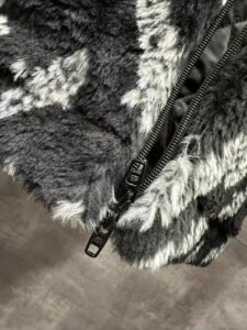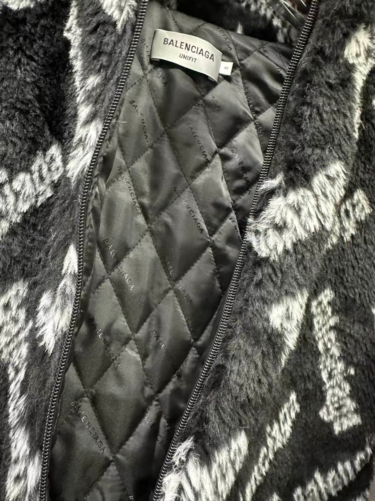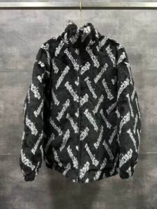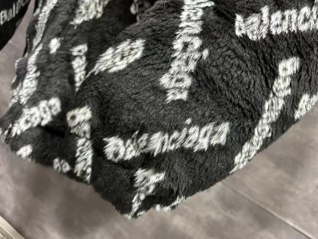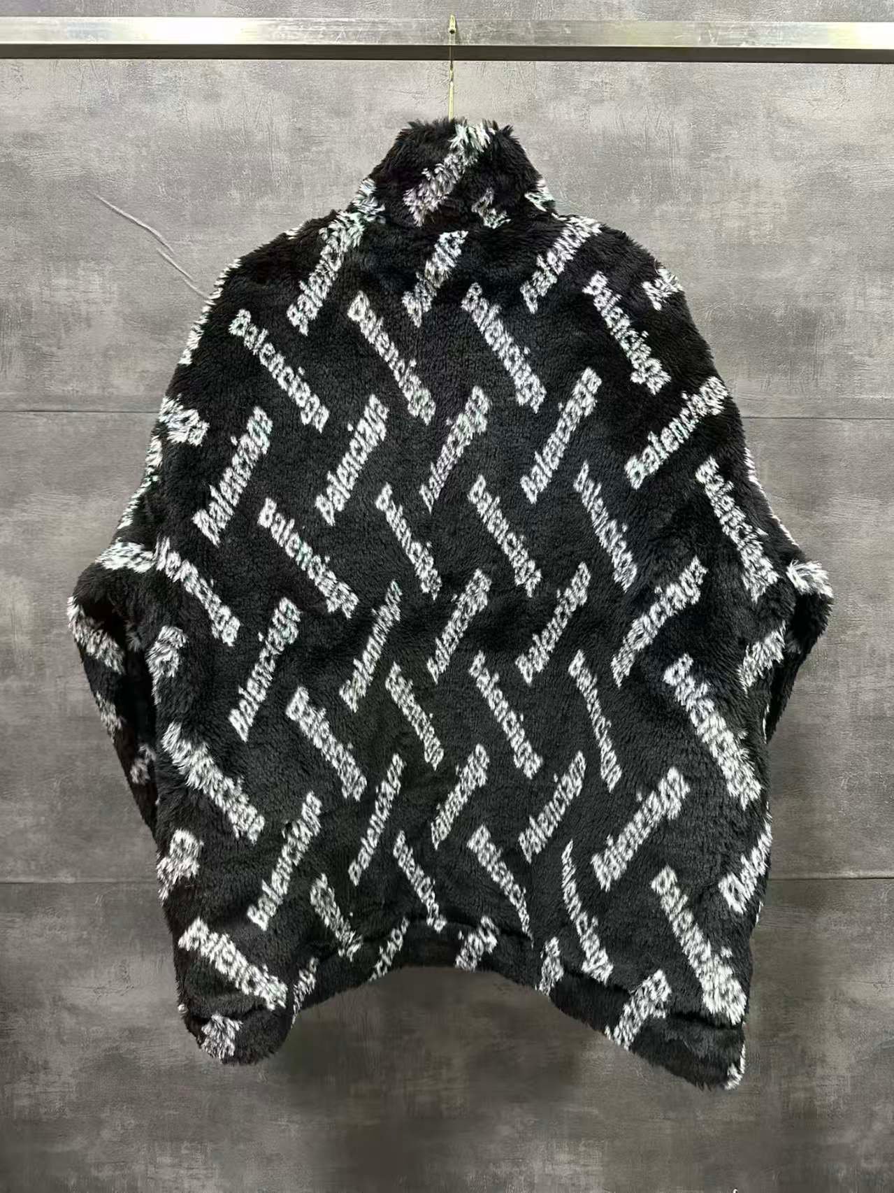 Balenciaga's thickened teddy-style short rabbit fur coat Design: Oversized black zip-front jacket made of plush, thick rabbit fur fabric, with a stand collar for warmth.Branding: Features a repeating diagonal pattern of “Balenciaga” lettering (white/gray fuzzy texture) covering the entire garment.Style: A luxurious, cozy statement piece ideal for bold, warm cold-weather outfits Contact by email:qiling0251014@gmali.com