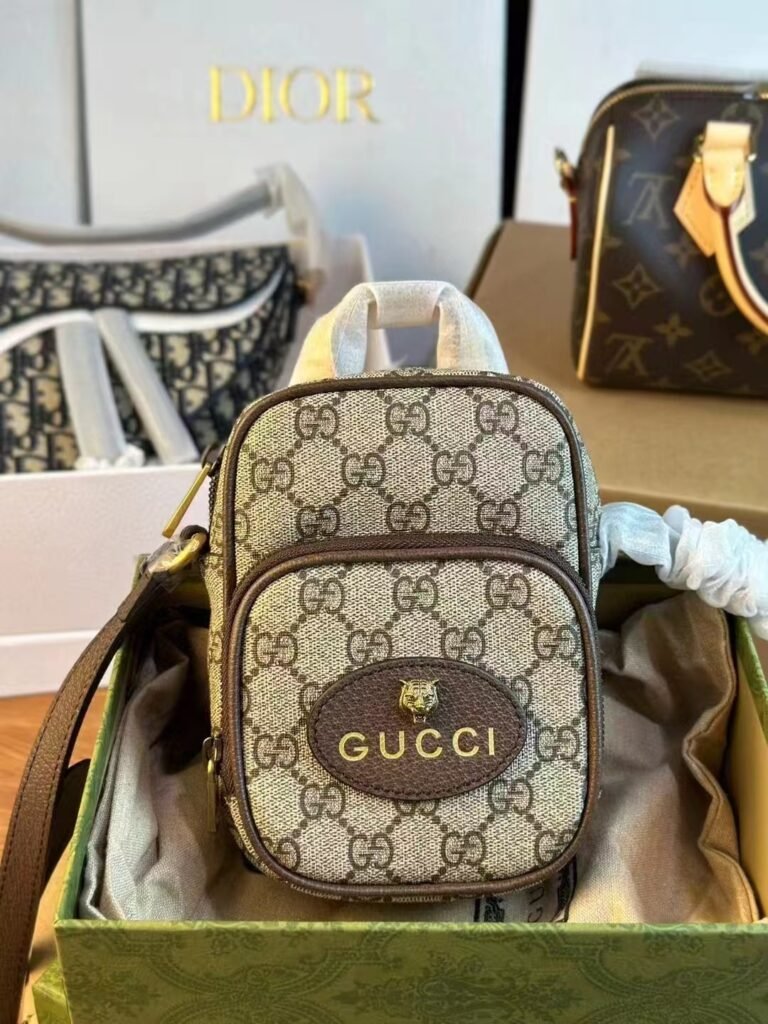 GUCCI Neo Vintage mini bag This is a GUCCI Neo Vintage mini bag, featuring the iconic GG Monogram print on canvas with leather trim, a gold-tone tiger-head detail, and the embossed “GUCCI” logo. It comes with a strap for versatile crossbody styling, embodying the brand’s retro-chic luxury and playful, compact design. Contact by email:qiling0251014@gmali.com