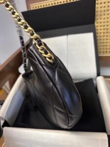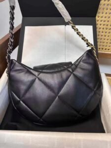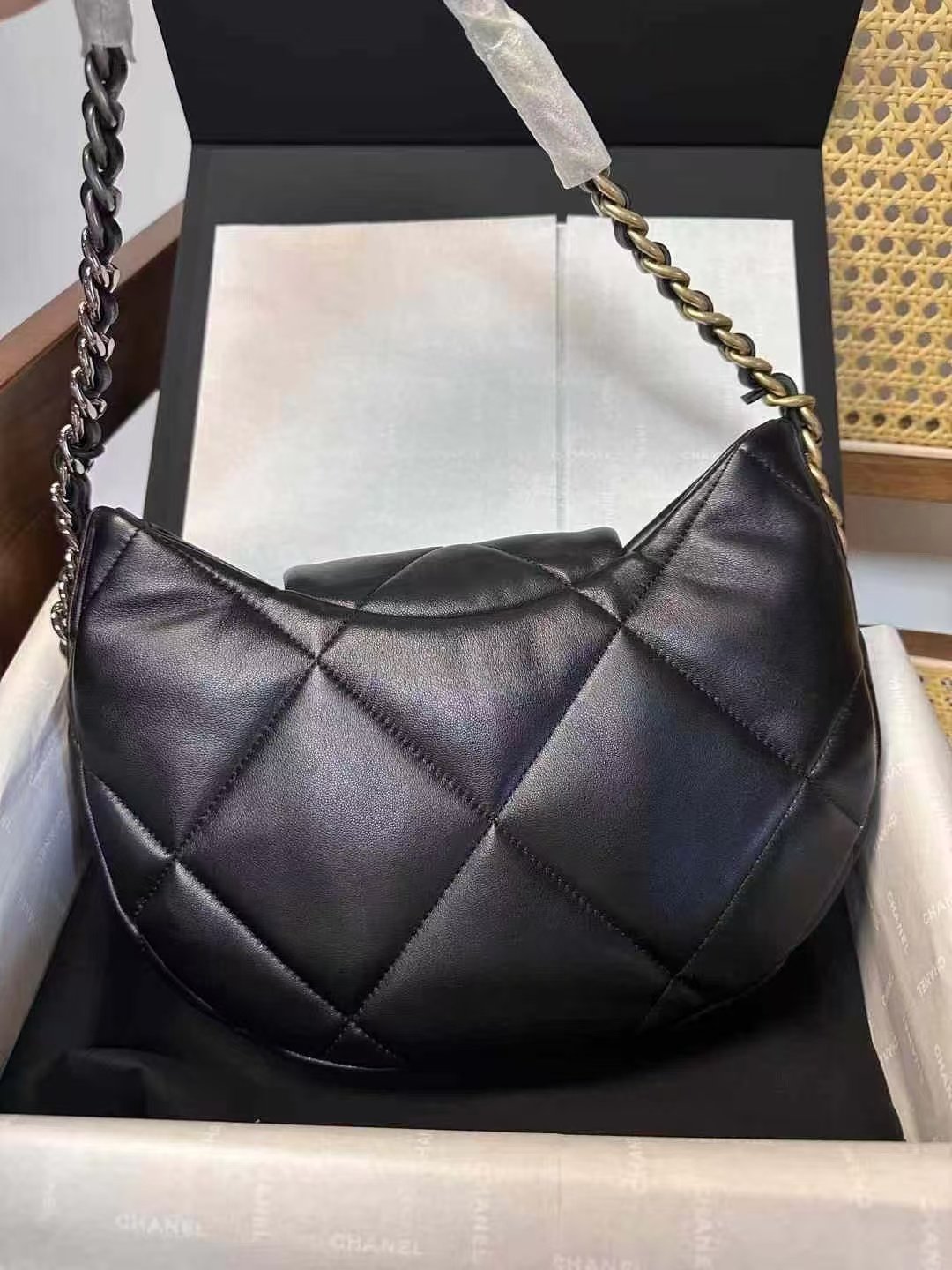 This is a CHANEL 19Bag (24C Early Spring Vacation Collection) in black leather, featuring iconic diamond quilting, a distinctive chain-wrapped gold-tone CC clasp, and a two-tone (gold/silver) leather-threaded chain strap. Its slouchy silhouette supports versatile styling (handheld, shoulder, or crossbody), embodying the brand’s modern, relaxed luxury with exclusive seasonal design details.
