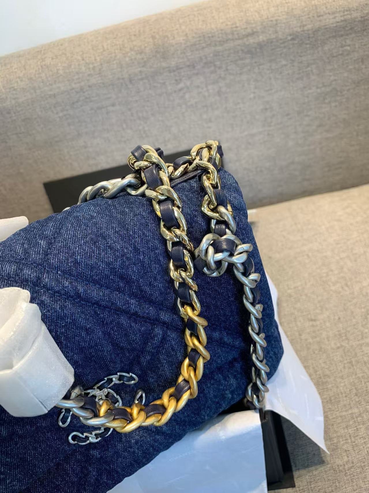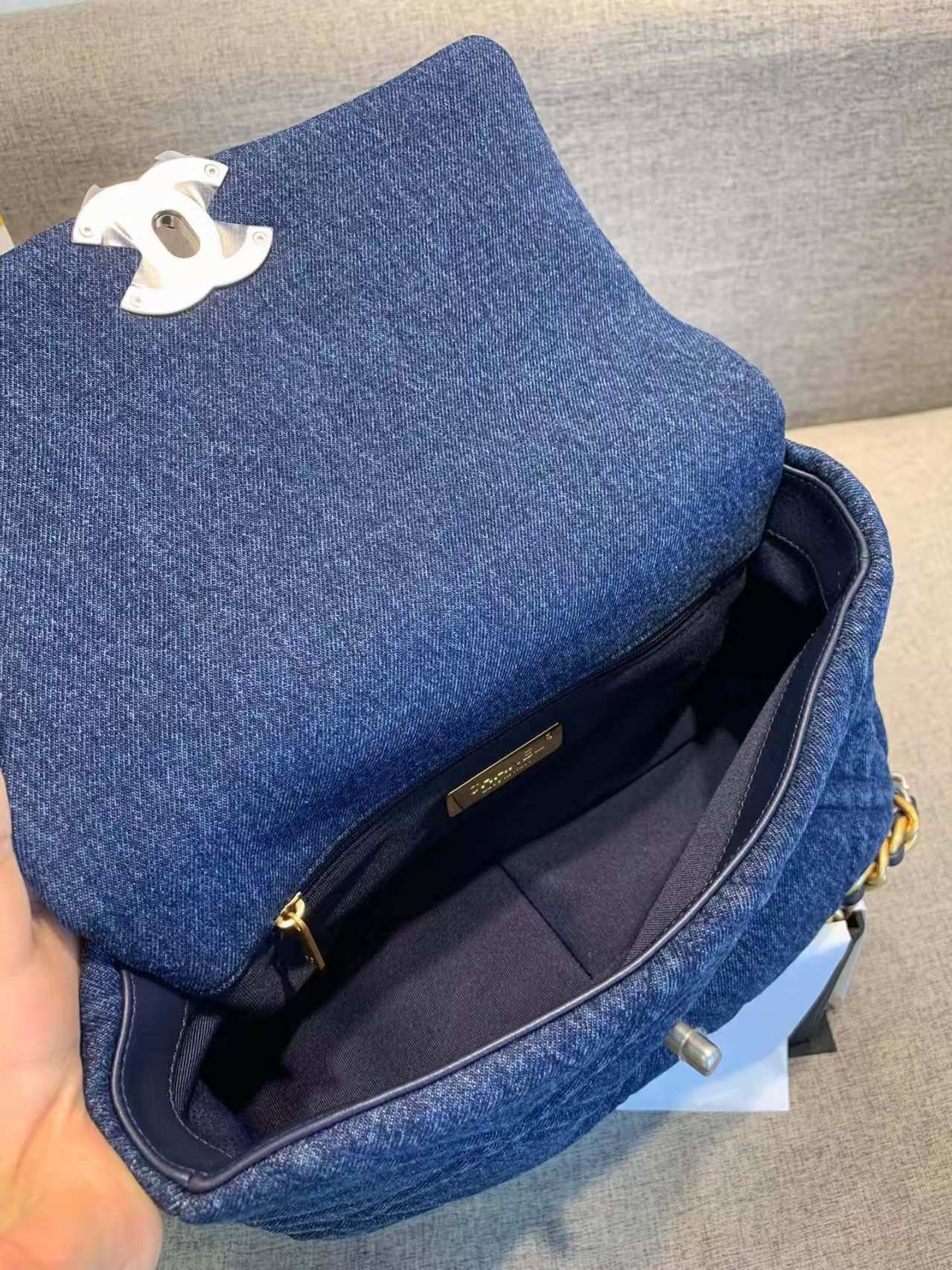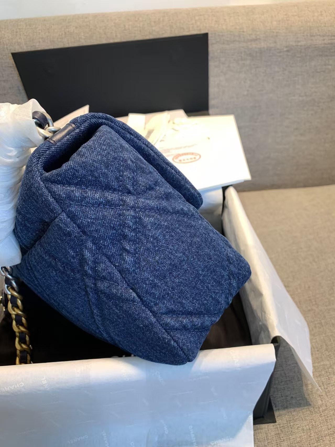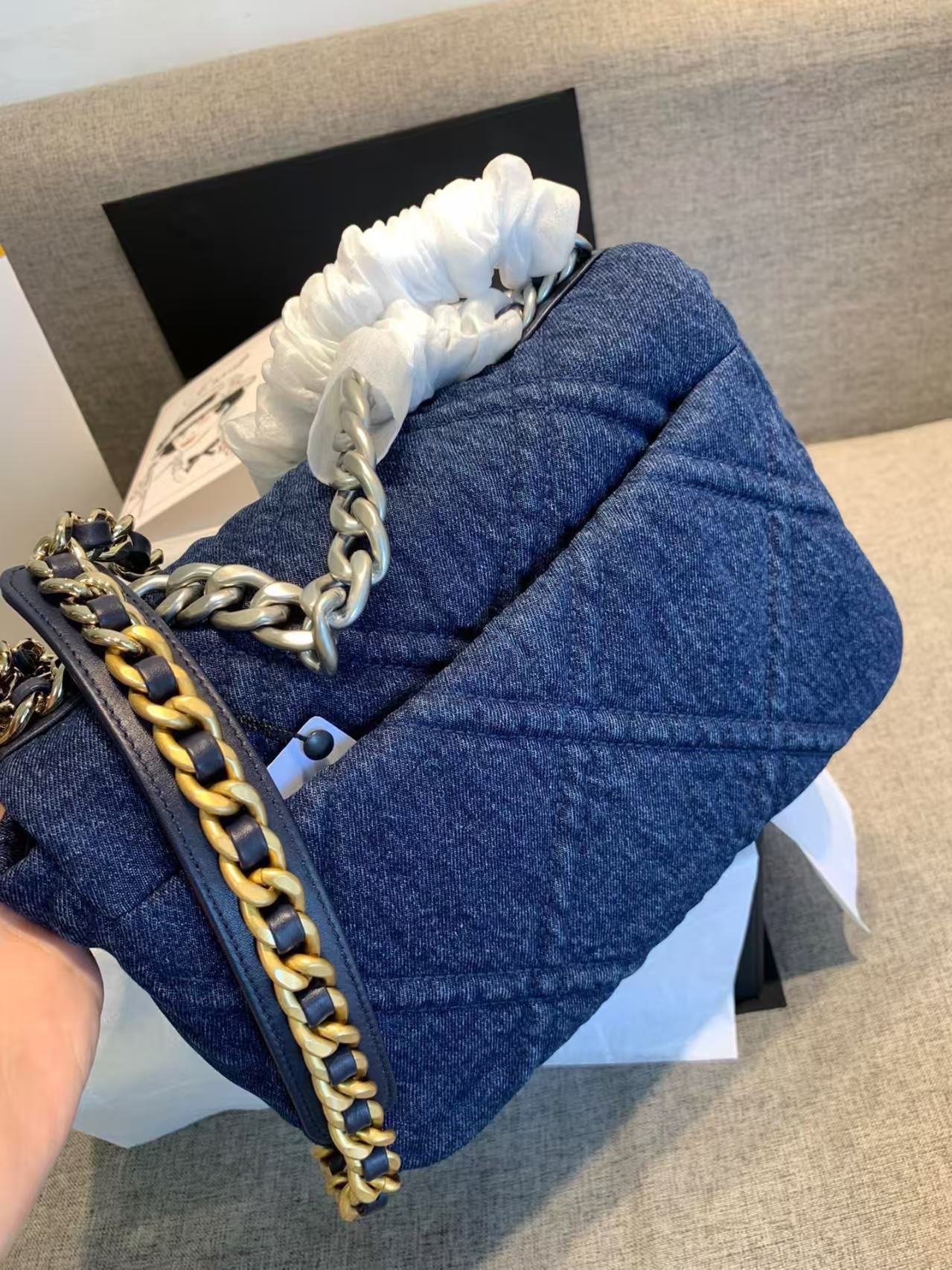 This is a CHANEL 19Bag small bag in blue denim, featuring iconic diamond quilting, a chain-wrapped silver-tone CC clasp, and a two-tone (silver/black) leather-threaded chain strap. Its slouchy silhouette + casual denim material blends the brand’s luxury with a relaxed, trendy vibe, suitable for shoulder/crossbody styling.