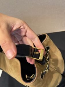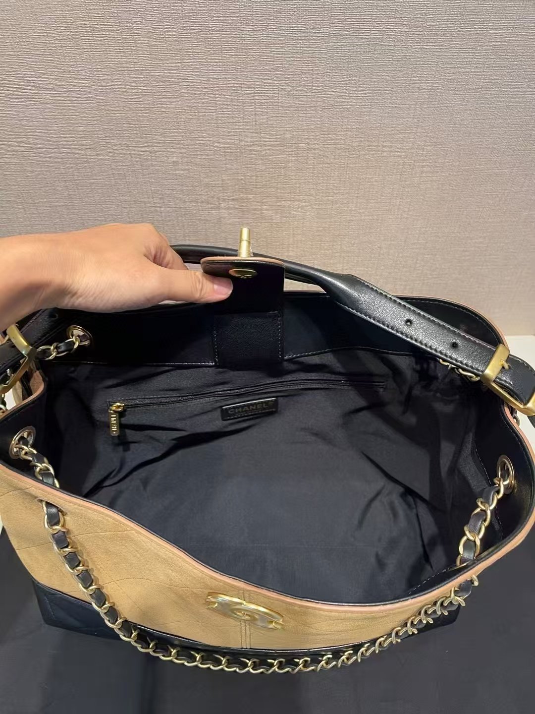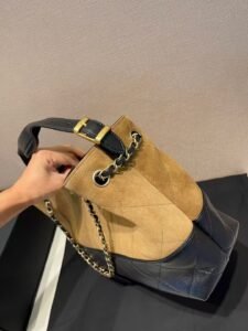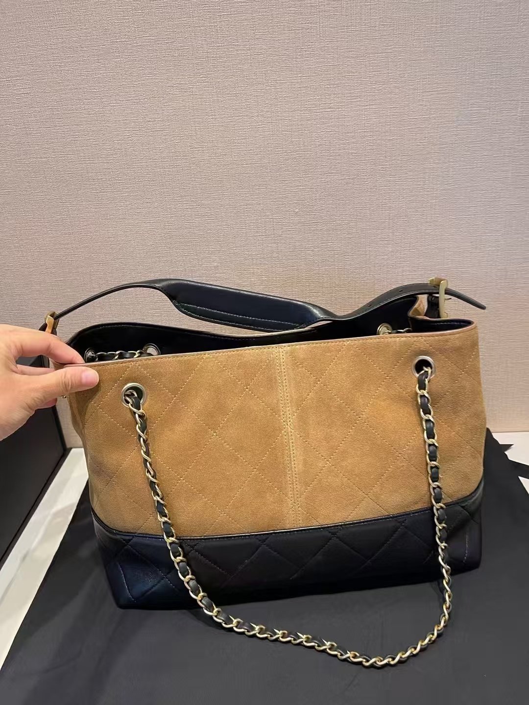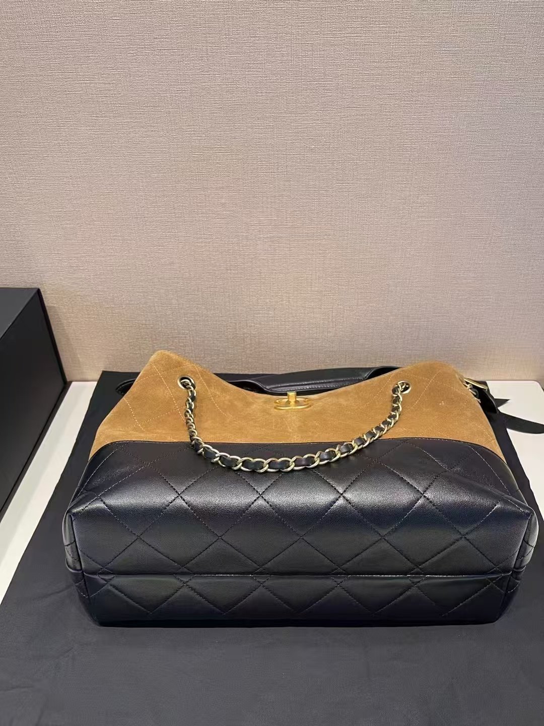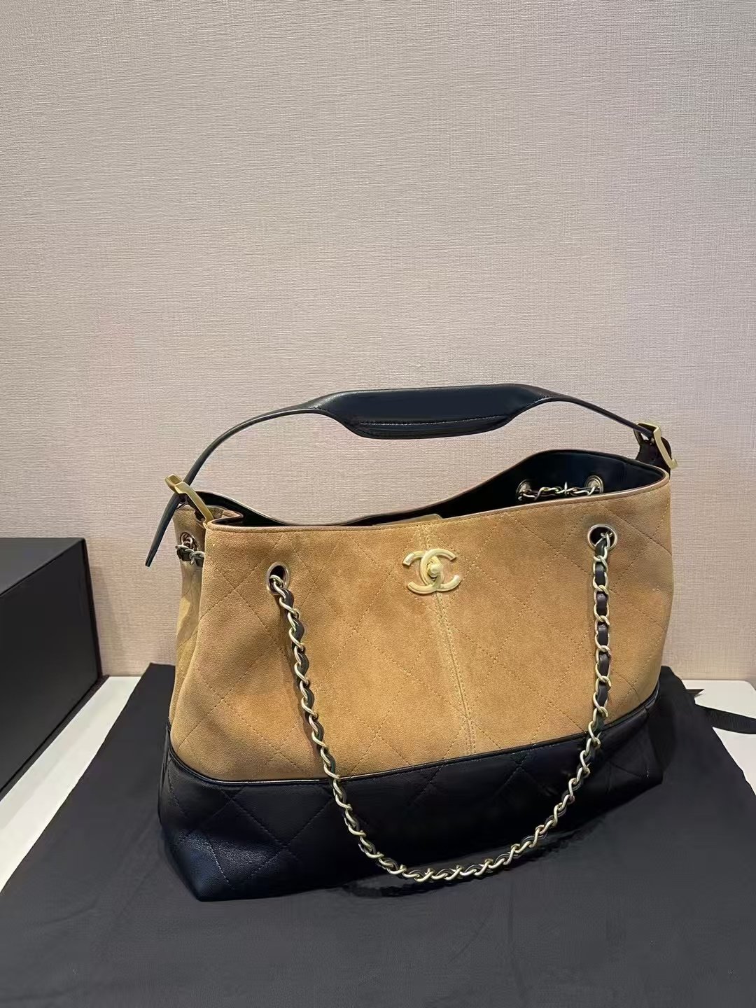 This is a Chanel 25A tote bag featuring a suede and leather color-block design in tan and black, with quilted detailing, the iconic interlocking CC logo, and a signature chain strap. Presented on a Chanel dust bag, it embodies the brand’s blend of luxury craftsmanship and contemporary style.