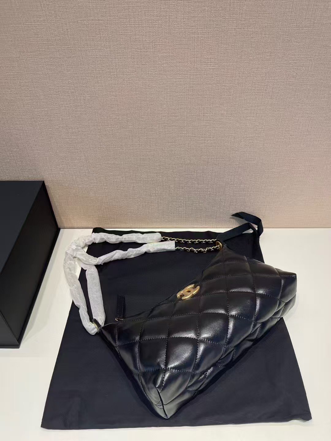 This is a CHANEL 25S bag, crafted from black lambskin with iconic diamond quilting, featuring the signature gold-tone interlocking CC logo and a chain strap (with leather inset) for handheld or shoulder styling. It embodies the brand’s timeless luxury and elegant, compact design, typical of its iconic seasonal collections.
