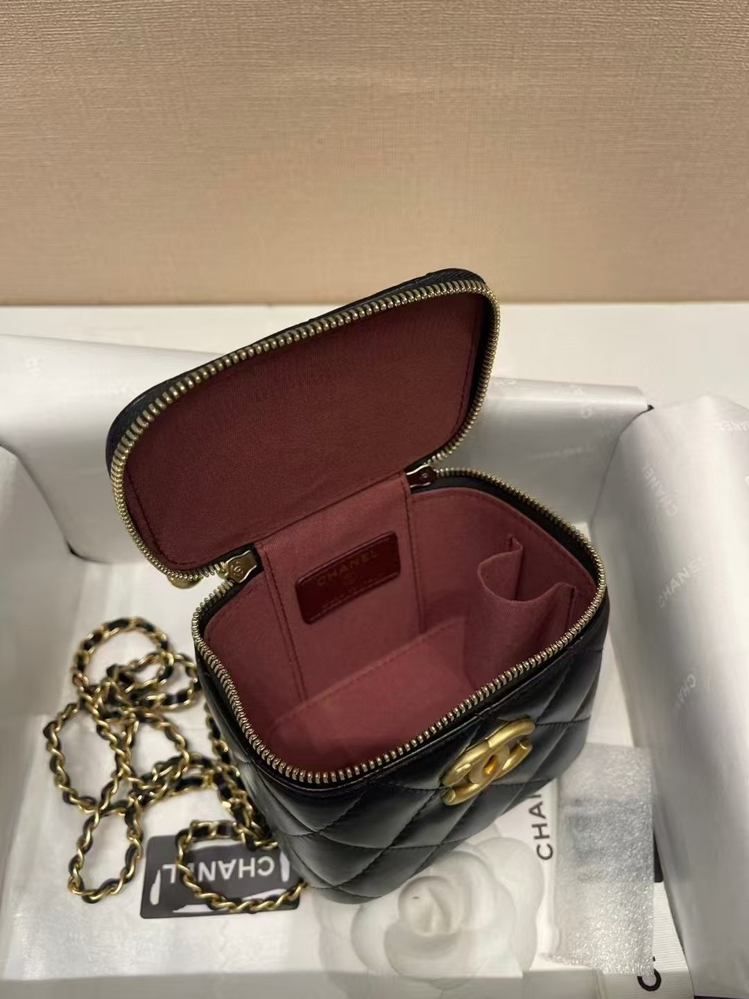 This is a CHANEL 25S small makeup bag in black calfskin, featuring iconic diamond quilting, the signature gold-tone interlocking CC logo, and a chain strap (with the sought-after “small gold ball” for adjustable length). Designed as a compact zippered accessory (for cosmetics or small essentials), it blends the brand’s timeless luxury with versatile carry options (crossbody/shoulder).