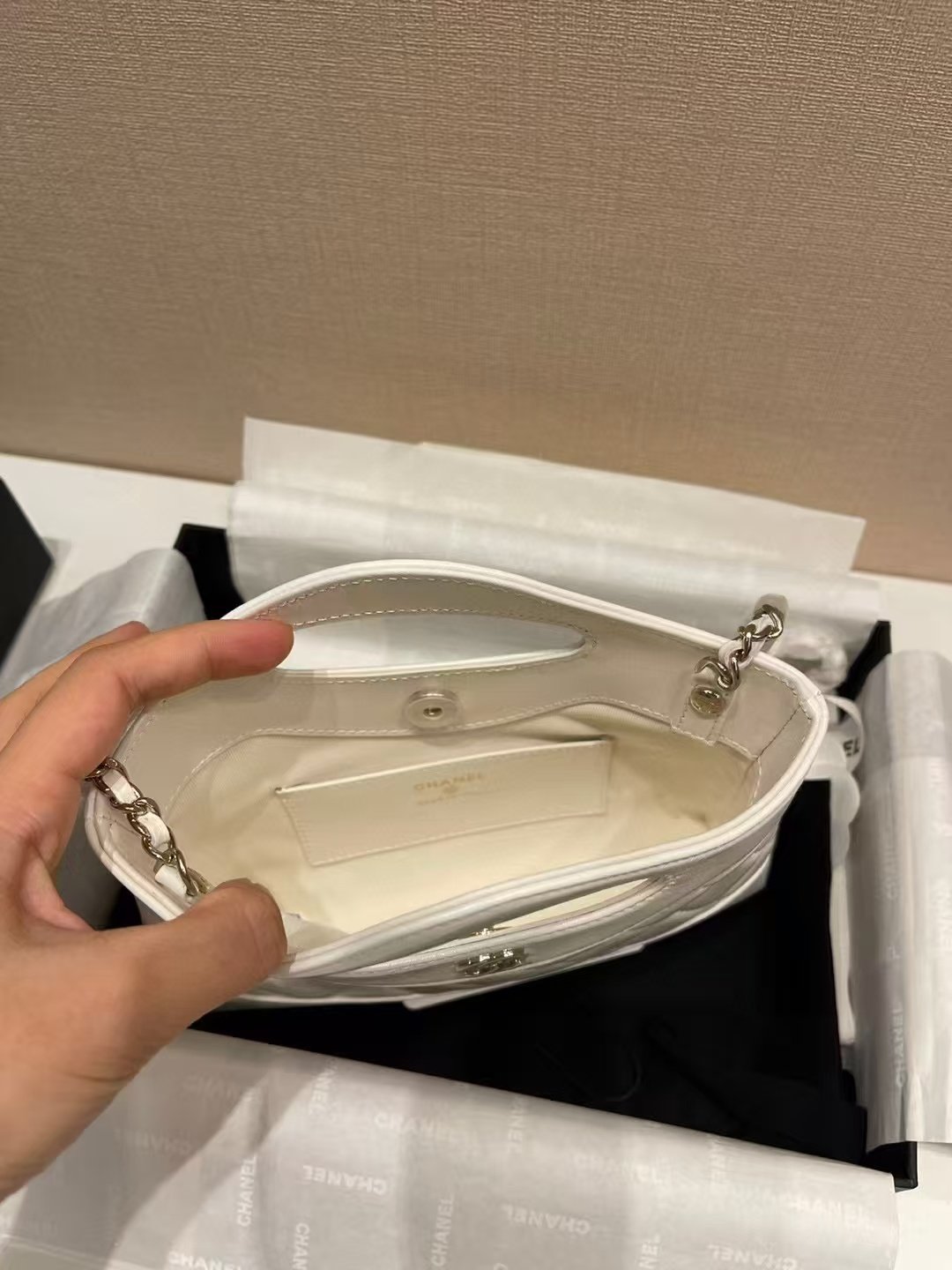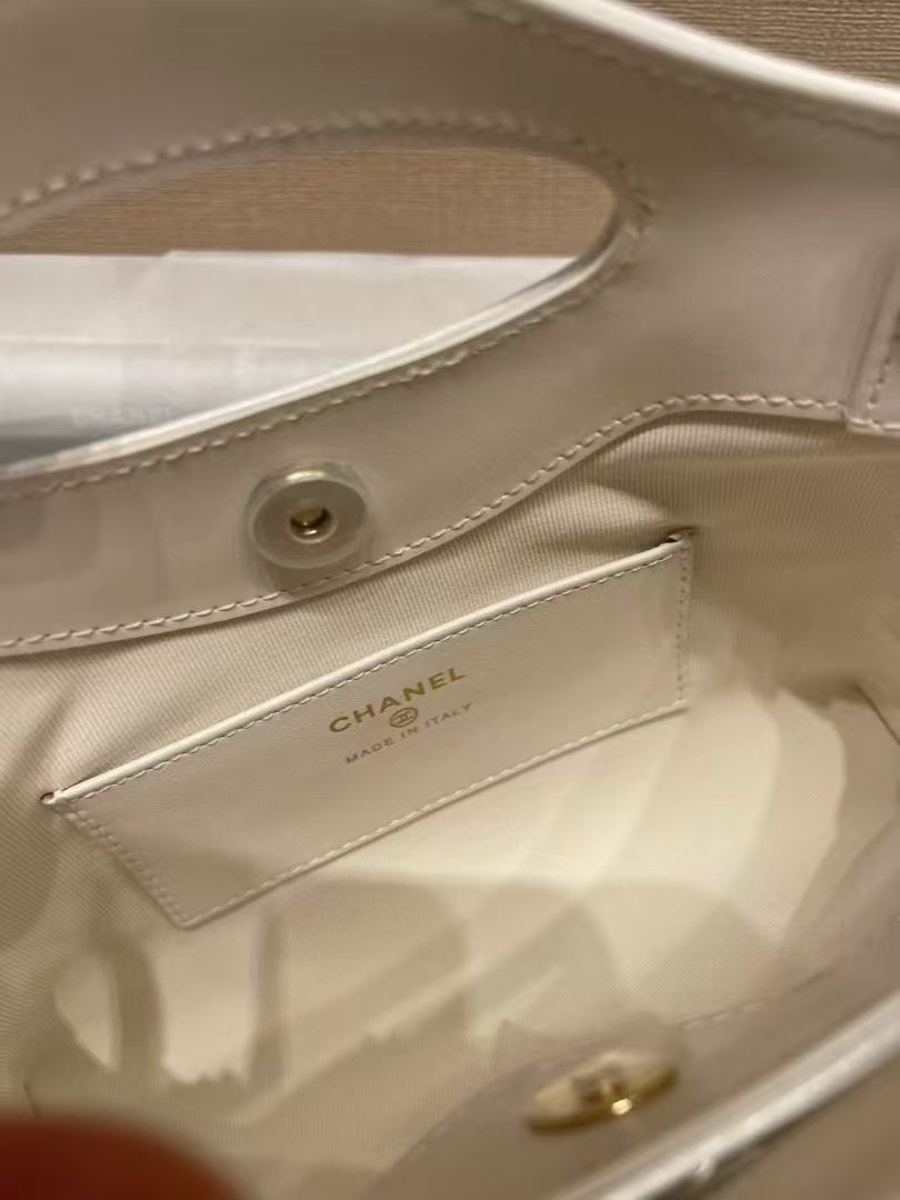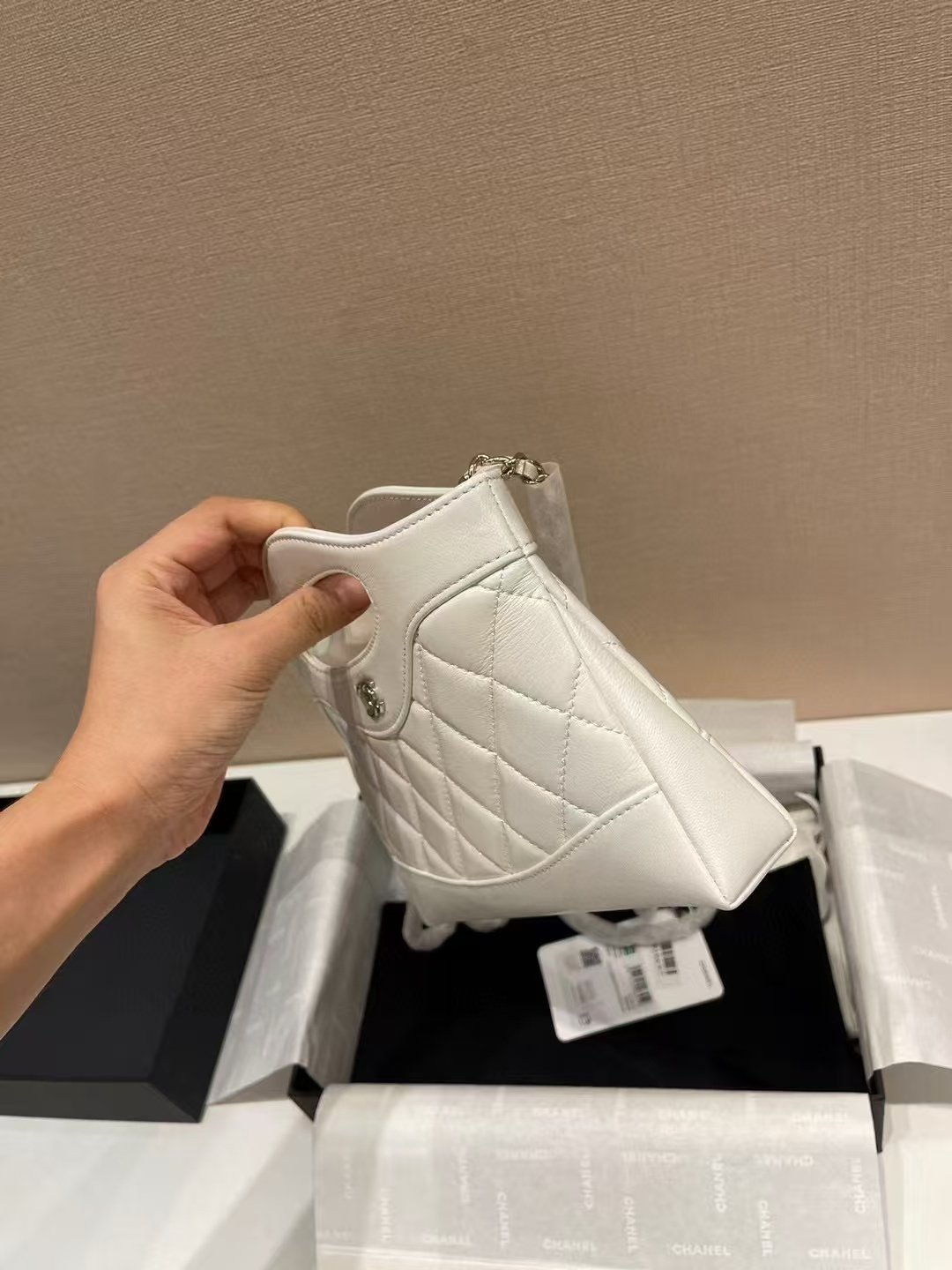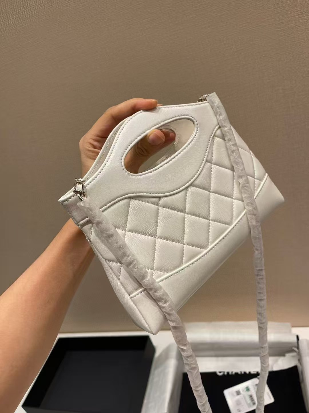 This is a Chanel 31 Nano handbag in white quilted leather, featuring the iconic interlocking CC logo, a unique top handle design, and presented in a Chanel box with branded packaging. It embodies the brand’s timeless elegance and compact, versatile style.