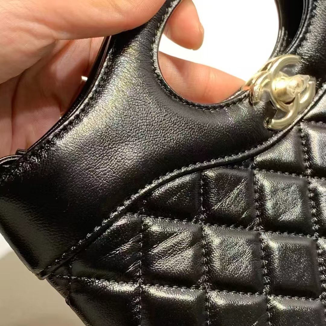 This is a CHANEL 31Bag (24C 早春度假系列) in mini size, crafted from black waxed calfskin with iconic diamond quilting, featuring the signature gold-tone hardware and a leather-threaded chain strap. Its distinctive cutout top handle + versatile strap design allows for handheld, shoulder, or crossbody styling, embodying the brand’s elegant, modern luxury with a seasonal exclusive touch.