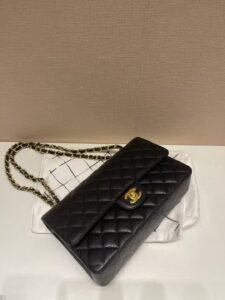 This is a CHANEL Classic Flap (CF REV) bag in black lambskin, featuring the iconic diamond quilting, signature gold-tone interlocking CC logo, and the brand’s classic leather-threaded chain strap (for versatile shoulder/crossbody styling). As a timeless “REV” (reissue-style) design, it embodies Chanel’s legendary luxury and elegant, enduring aesthetic.
