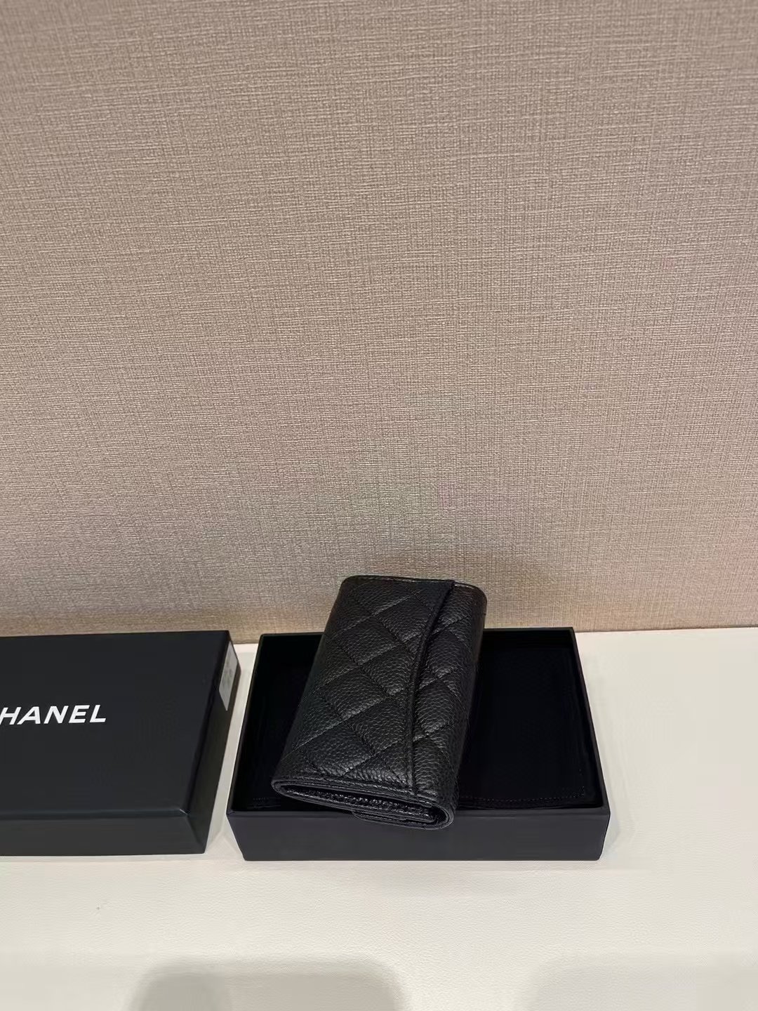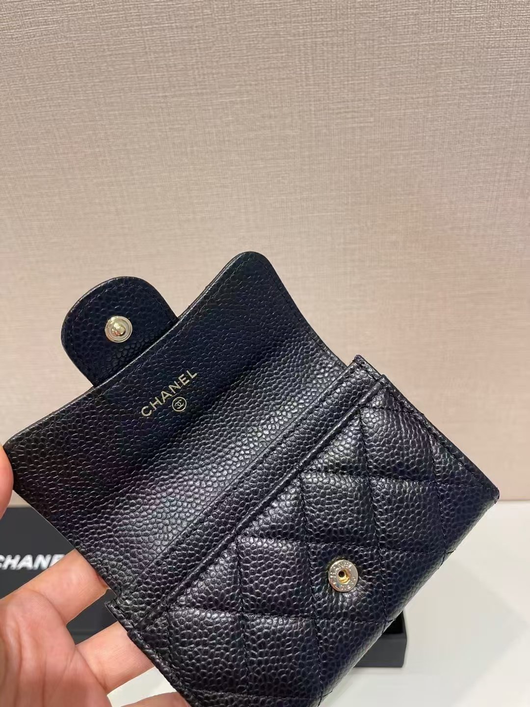 This is a CHANEL classic wallet, crafted from black grained calfskin with iconic diamond quilting and the signature gold-tone interlocking CC logo closure. Designed as a compact flip-style accessory (for cards, cash and small essentials), it embodies the brand’s timeless luxury and elegant, functional everyday design.
