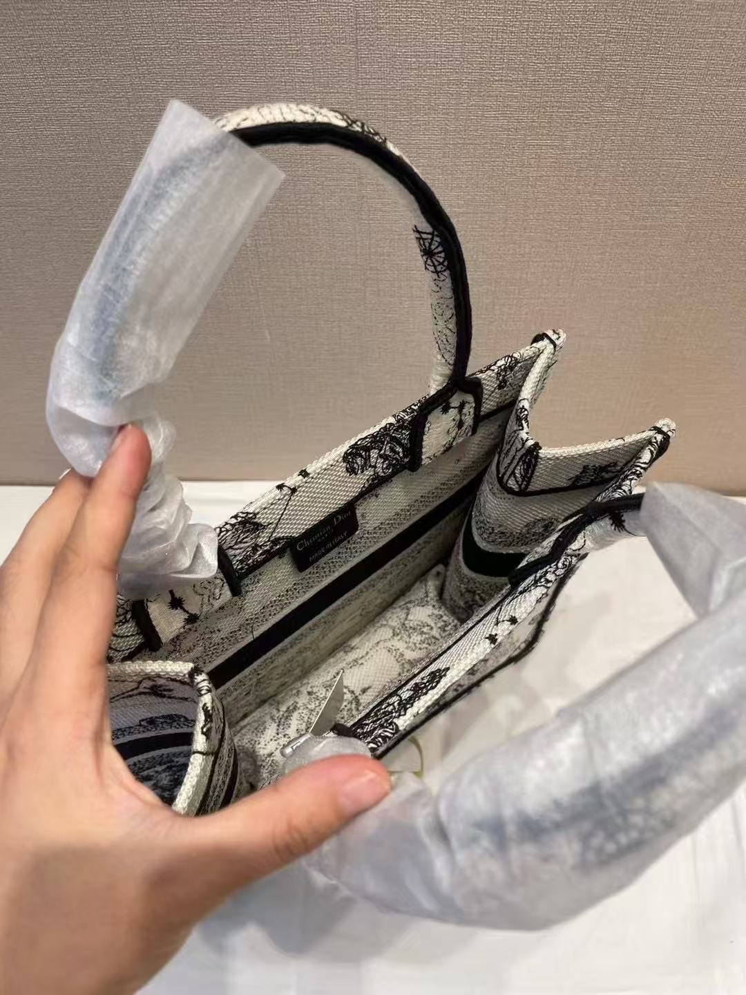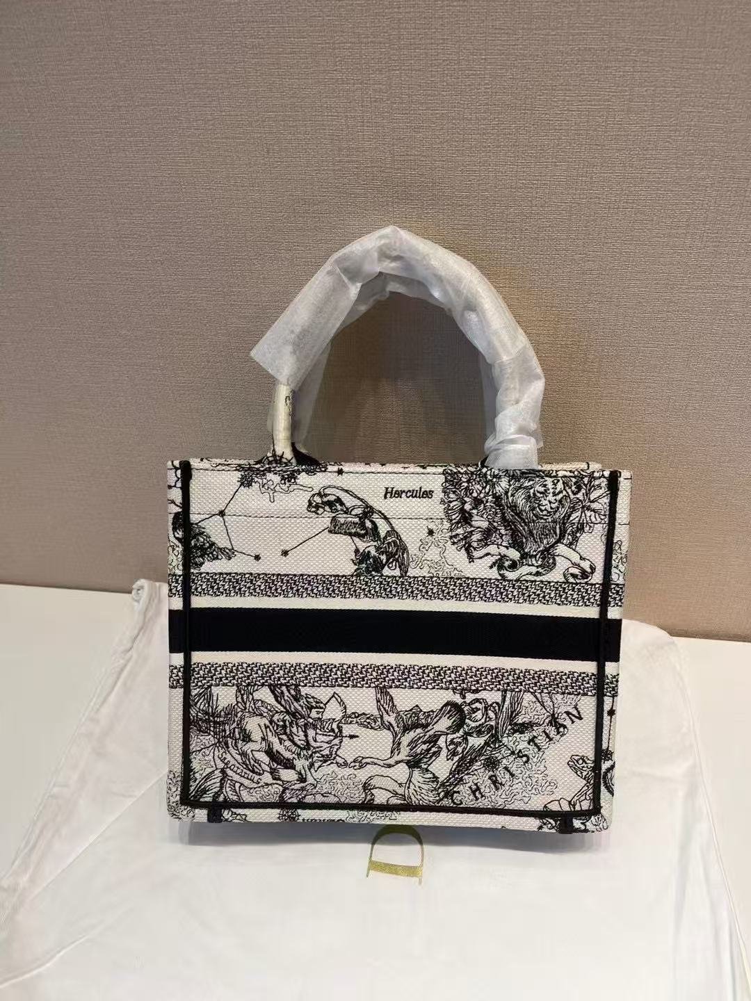 This is a Christian Dior tote bag featuring a black-and-white toile de Jouy pattern with mythological and zodiac motifs (like “Hercules”). It has the bold “CHRISTIAN DIOR PARIS” stripe, structured handles, and is presented on a Dior dust bag, blending artistic design with the brand’s luxury heritage.