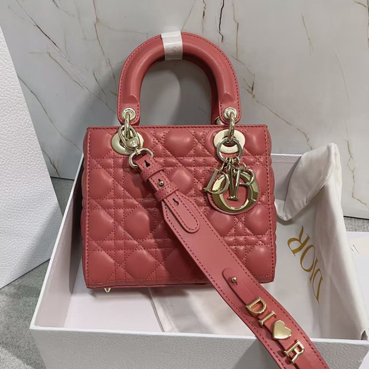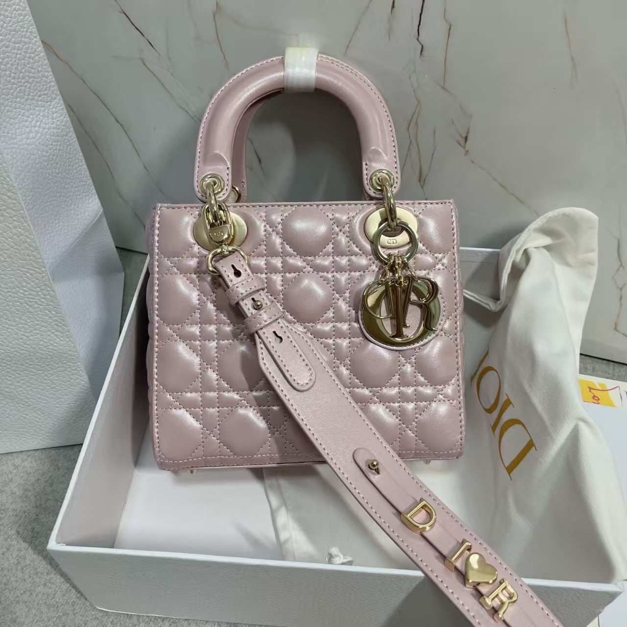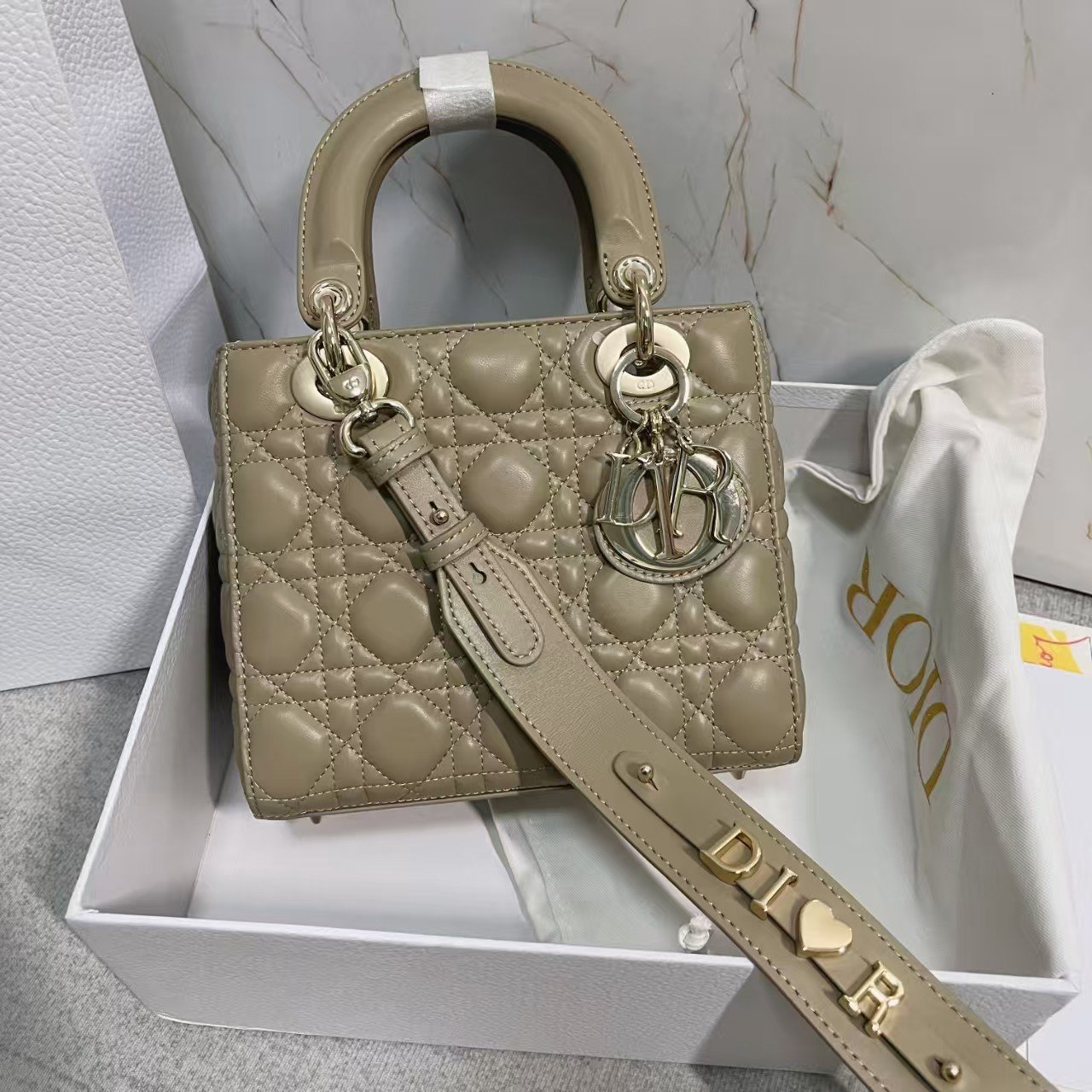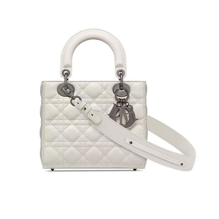 This is the DIOR Lady Dior My ABCDior bag, crafted from soft gray leather with the iconic cannage (quilted lattice) stitching. It features matching gray hardware (including the “CD” logo charm) and top handles (with protective covers), supporting handheld carry (and often compatible with detachable straps for shoulder/crossbody use). A sleek, customizable luxury piece (known for its monogrammable charms) that blends timeless design with a modern, muted gray hue—ideal for refined daily or semi-formal looks.