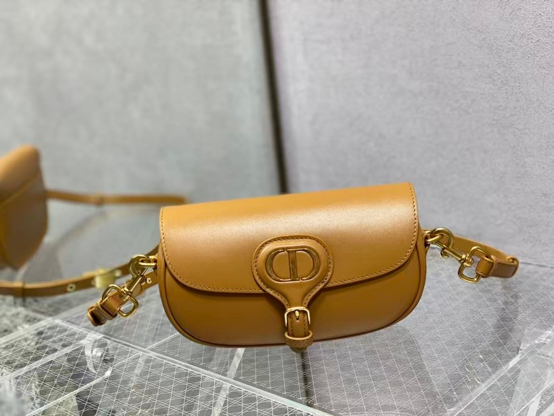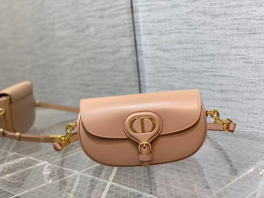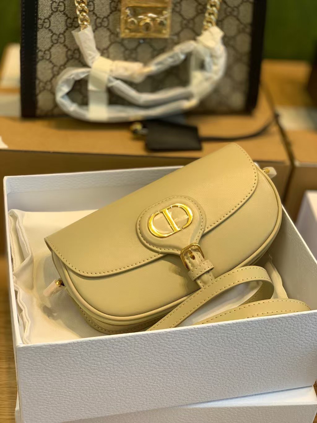 This is the DIOR Bobby East-West bag, crafted from smooth off-white calfskin with a sleek crescent (half-moon) silhouette. It features a prominent gold-tone “CD” clasp, plus an adjustable/detachable strap—supporting handheld, shoulder, or crossbody carry. A minimalist, elegant luxury piece with a polished finish, perfect for elevating both casual and refined looks.