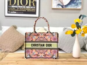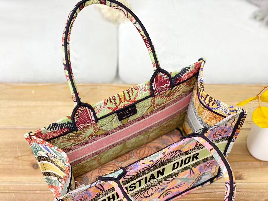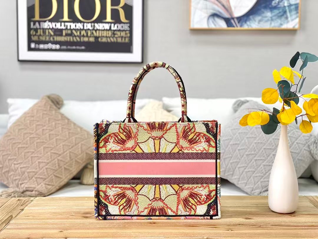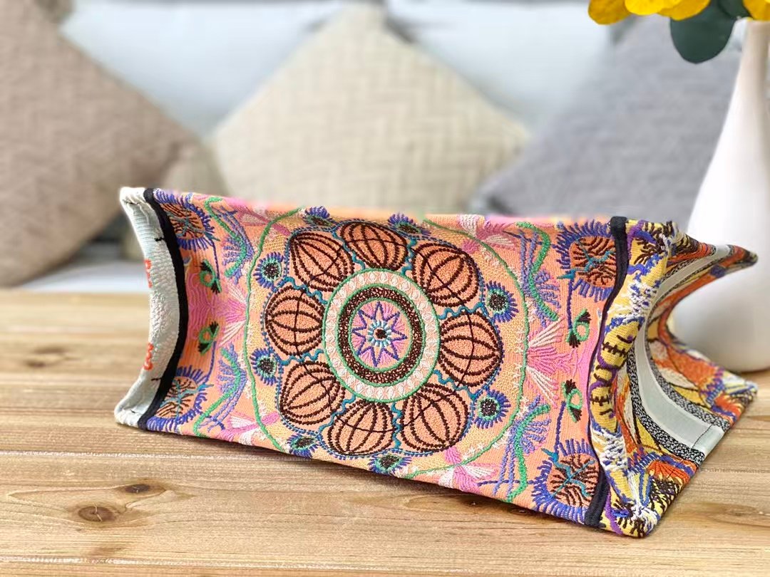 This is the Dior Book Tote: a large-capacity canvas tote featuring intricate, colorful embroidered patterns (with floral/geometric motifs) and a bold “CHRISTIAN DIOR PARIS” stripe. It has integrated logo-branded top handles, blending artistic design with spacious functionality—ideal for daily use or travel.