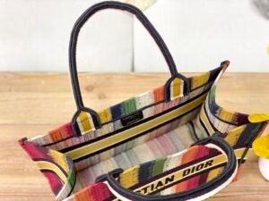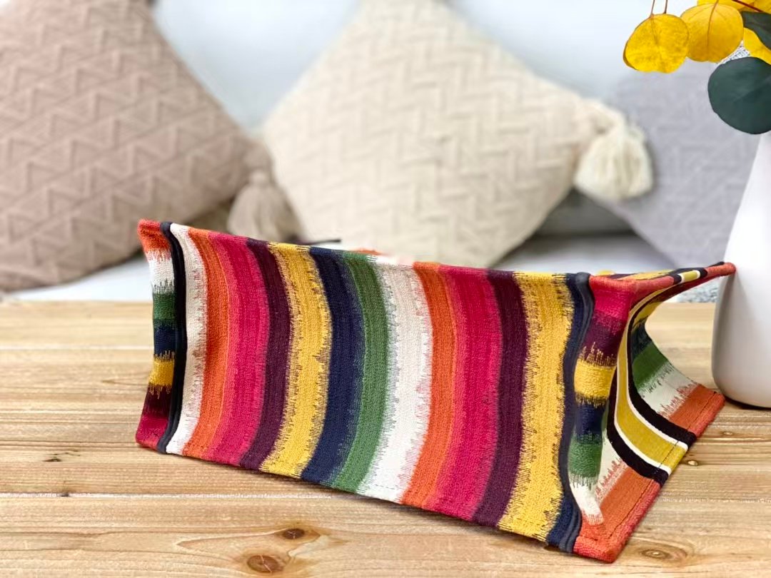 This is the DIOR BookTote D-Stripes tote: made of canvas with vibrant multicolored stripes, featuring a bold “CHRISTIAN DIOR PARIS” embroidered stripe and a logo-branded top handle. It’s a spacious, eye-catching handbag ideal for daily use, blending playful, colorful design with the BookTote’s signature practicality.