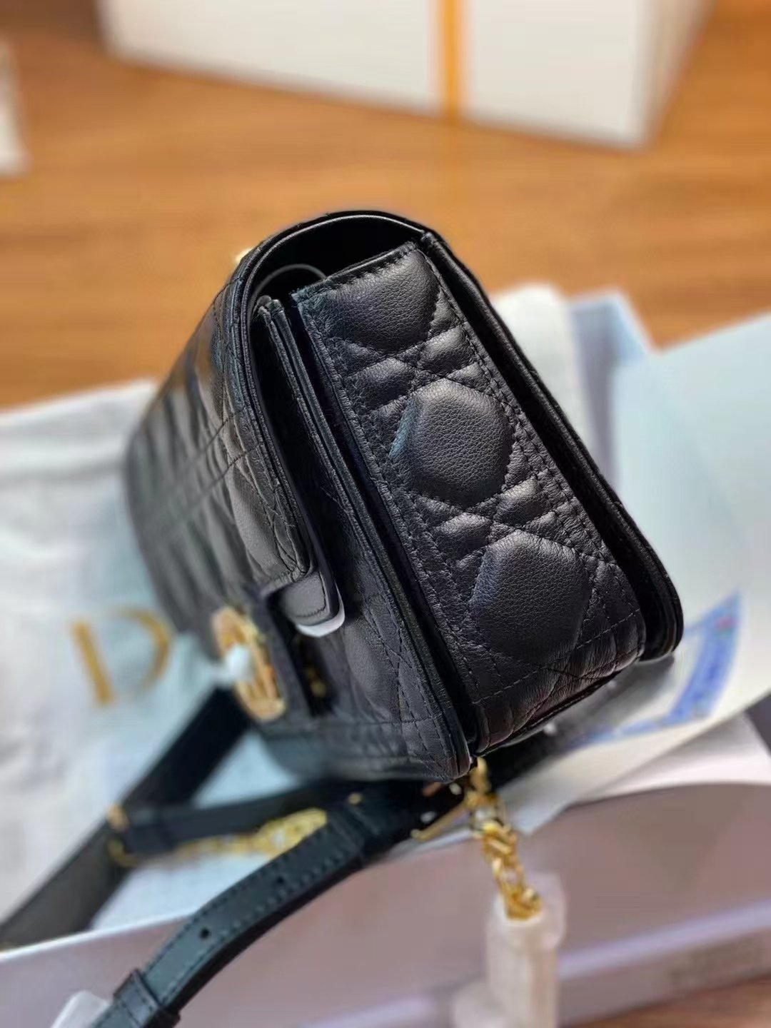 This is the DIOR Jolie bag, crafted from black calfskin with iconic cannage quilting. It features a gold-tone “CD” clasp (adorned with a pearl detail), plus a detachable, adjustable leather-and-chain strap—supporting handheld, shoulder, or crossbody styling. A chic, elegant luxury piece that blends classic detailing with delicate, trendy accents.