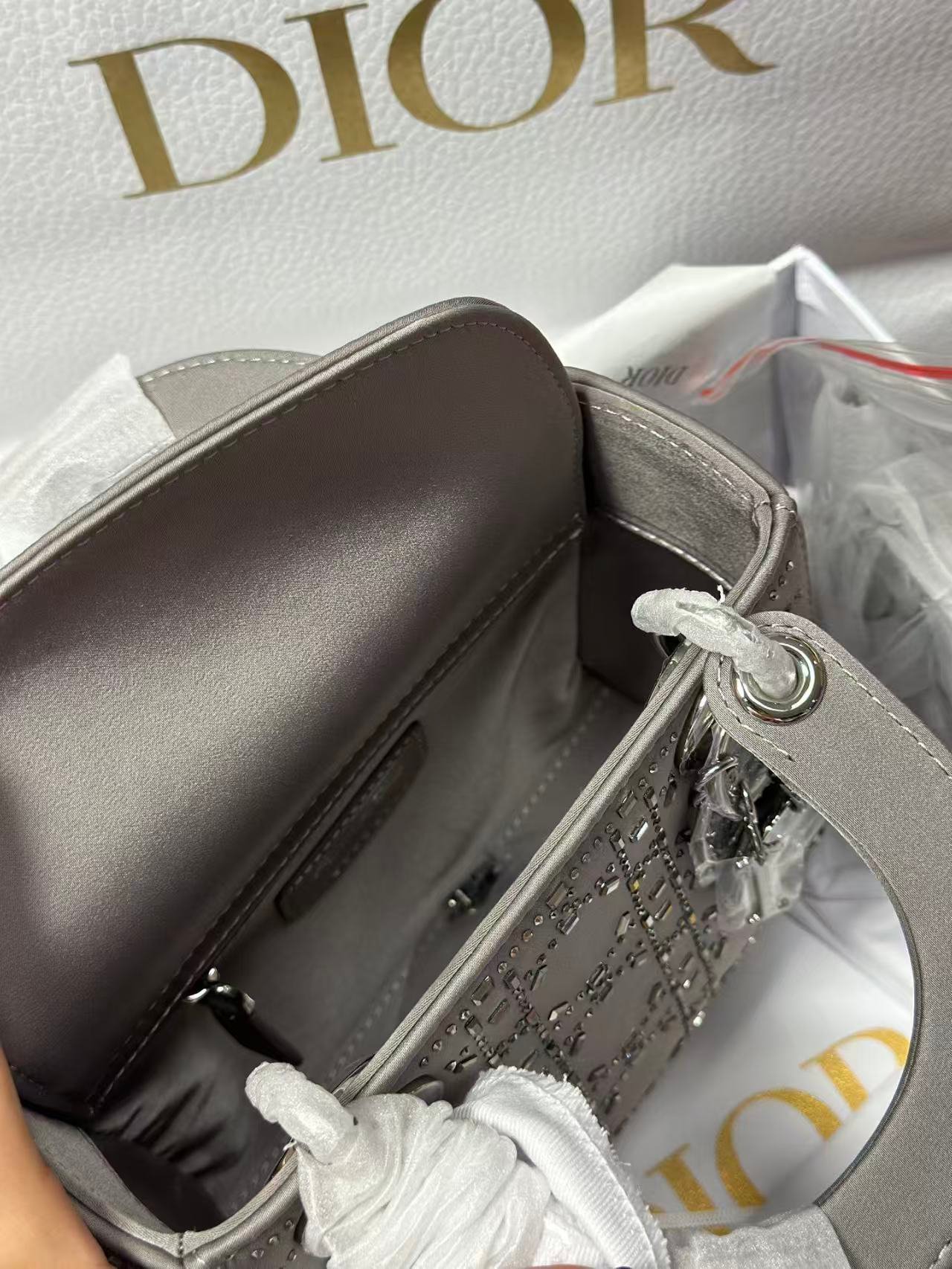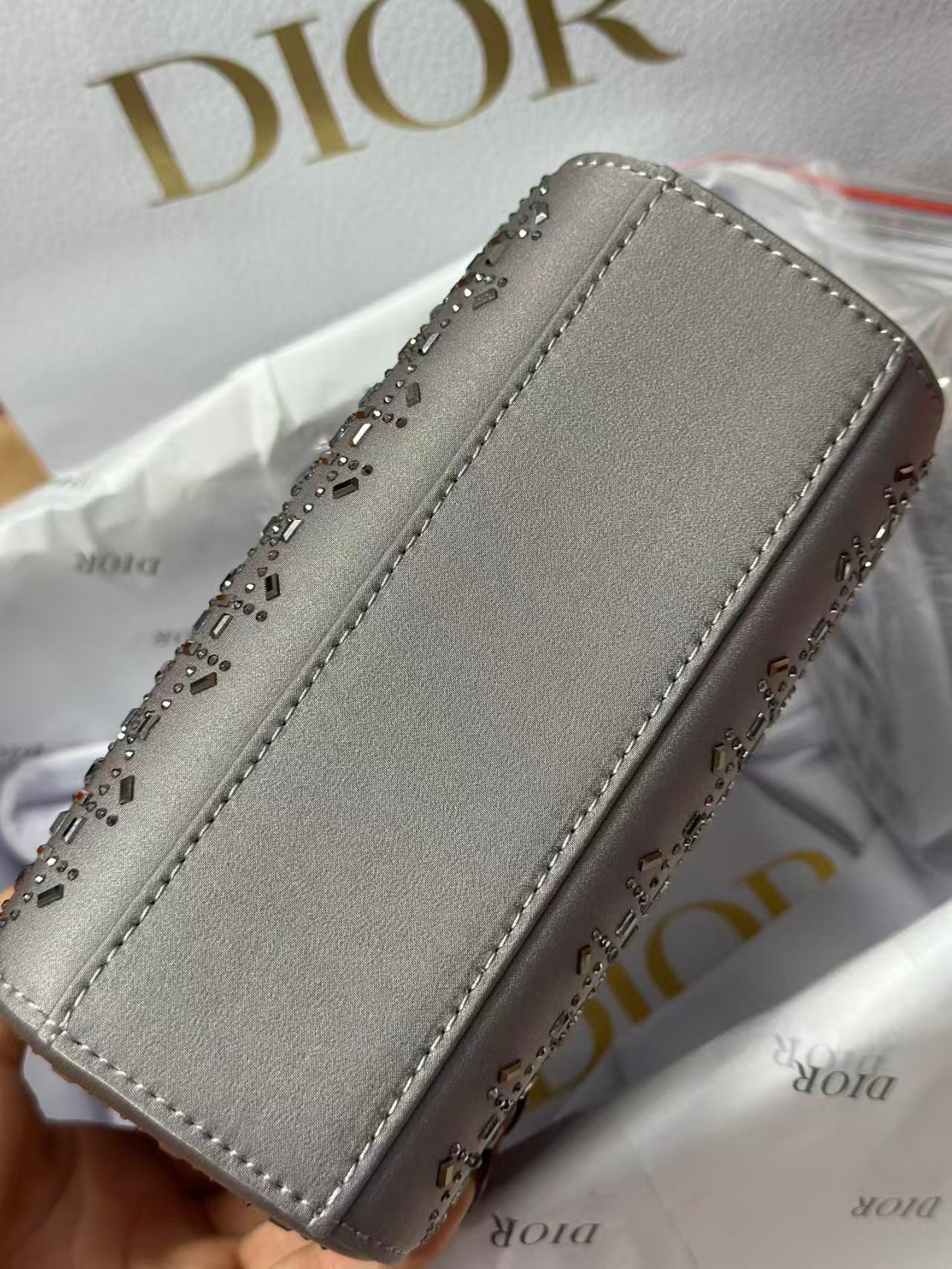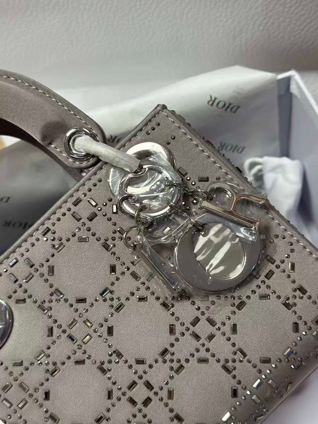 This is the DIOR Lady Dior (3-compartment) bag, crafted from gray satin adorned with sparkling bead/stone embellishments. It features the signature “D.I.O.R” charm, top handles, and an adjustable/detachable strap—supporting handheld, shoulder, or crossbody styling. A glamorous, luxurious piece with a soft satin texture and eye-catching decorative details, perfect for dressier occasions
