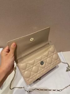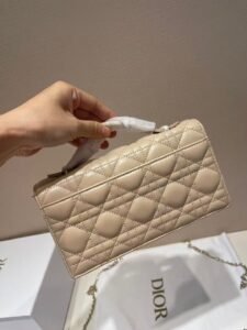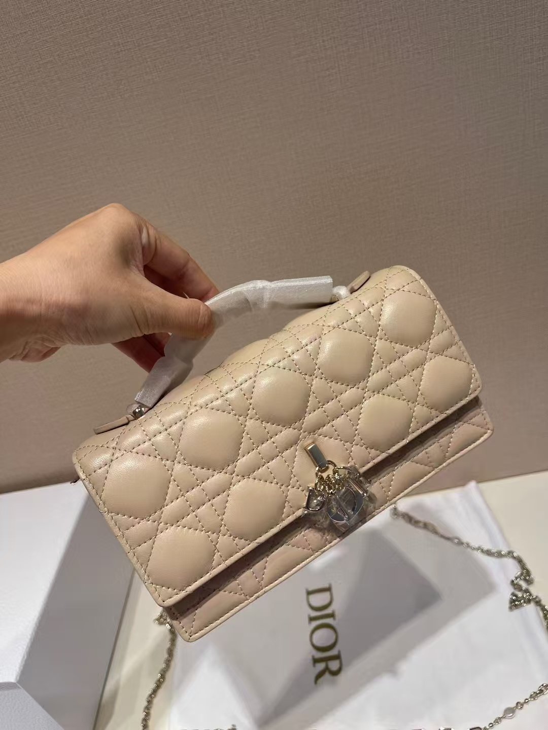 This is the DIOR My Dior mini bag, crafted from beige lambskin with the iconic cannage quilting. It features a polished silver-tone “D.I.O.R” charm and a distinctive chain strap (blended with pearl accents), supporting handheld, shoulder, or crossbody styling. A compact, elegant luxury piece with delicate, trendy details.