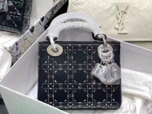 This is the DIOR Lady Dior (3-compartment mini style): made of satin fabric in gray, adorned with matching beaded cannage patterns. It features a detachable adjustable strap, silver-tone hardware, and the signature “D.I.O.R” charm, supporting shoulder, crossbody, or handheld carry. A sleek, glamorous accessory ideal for formal occasions.