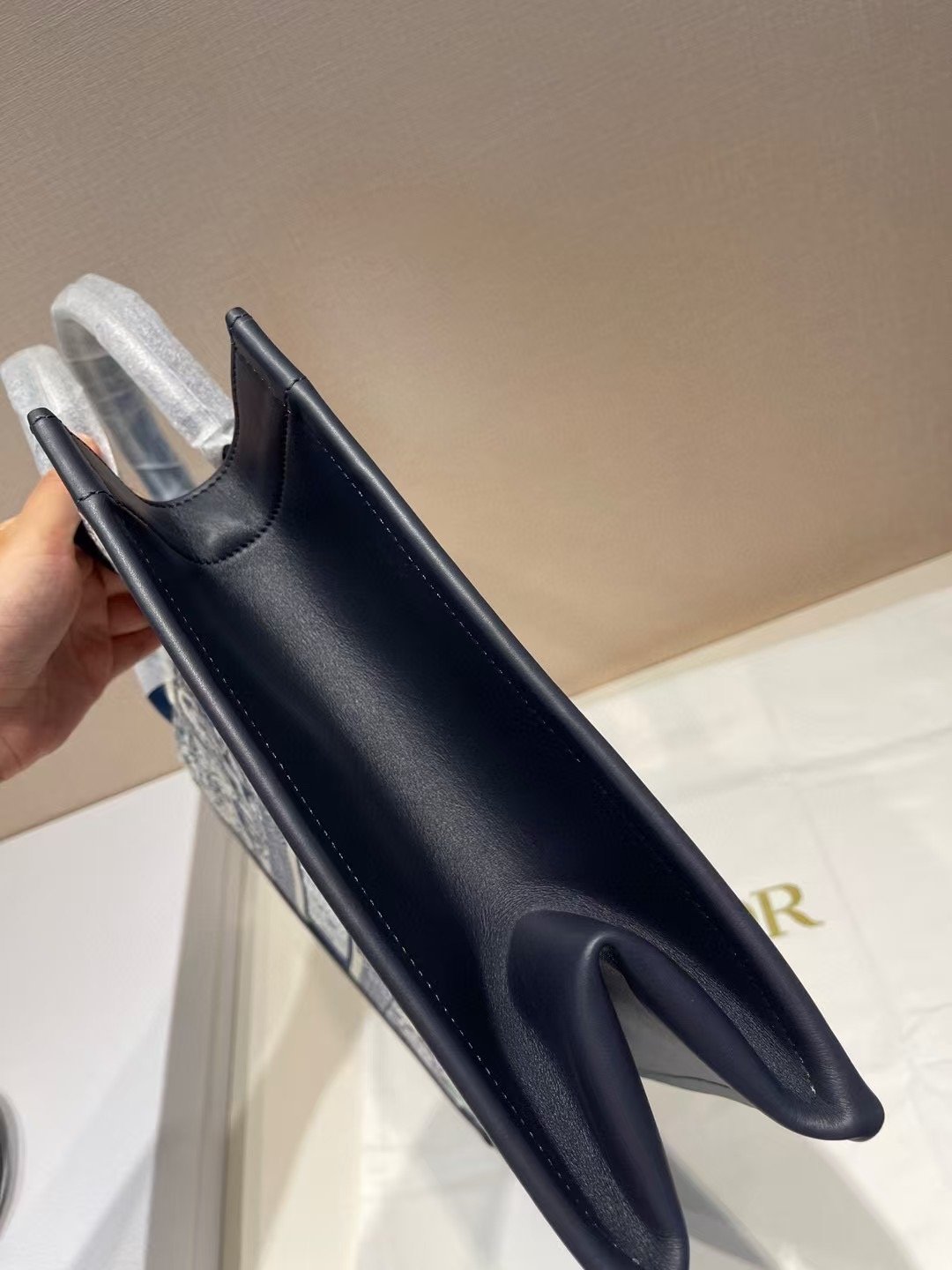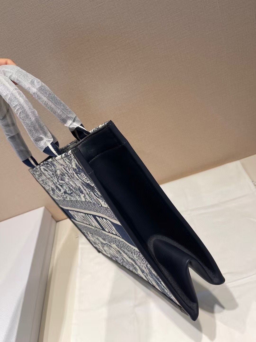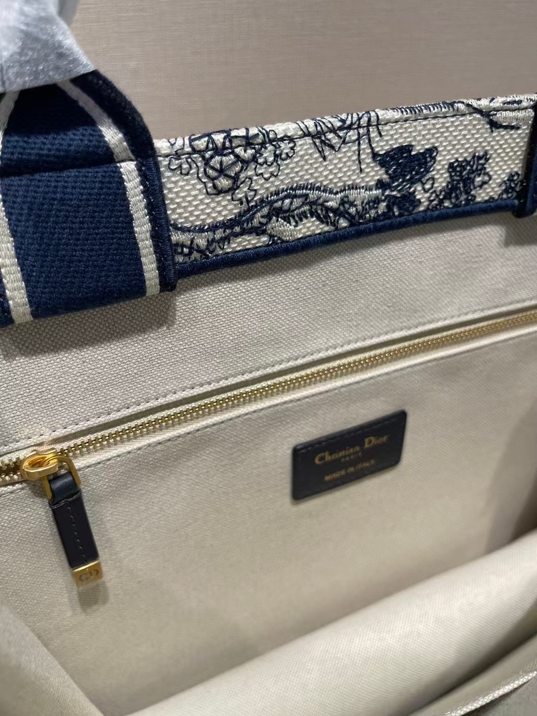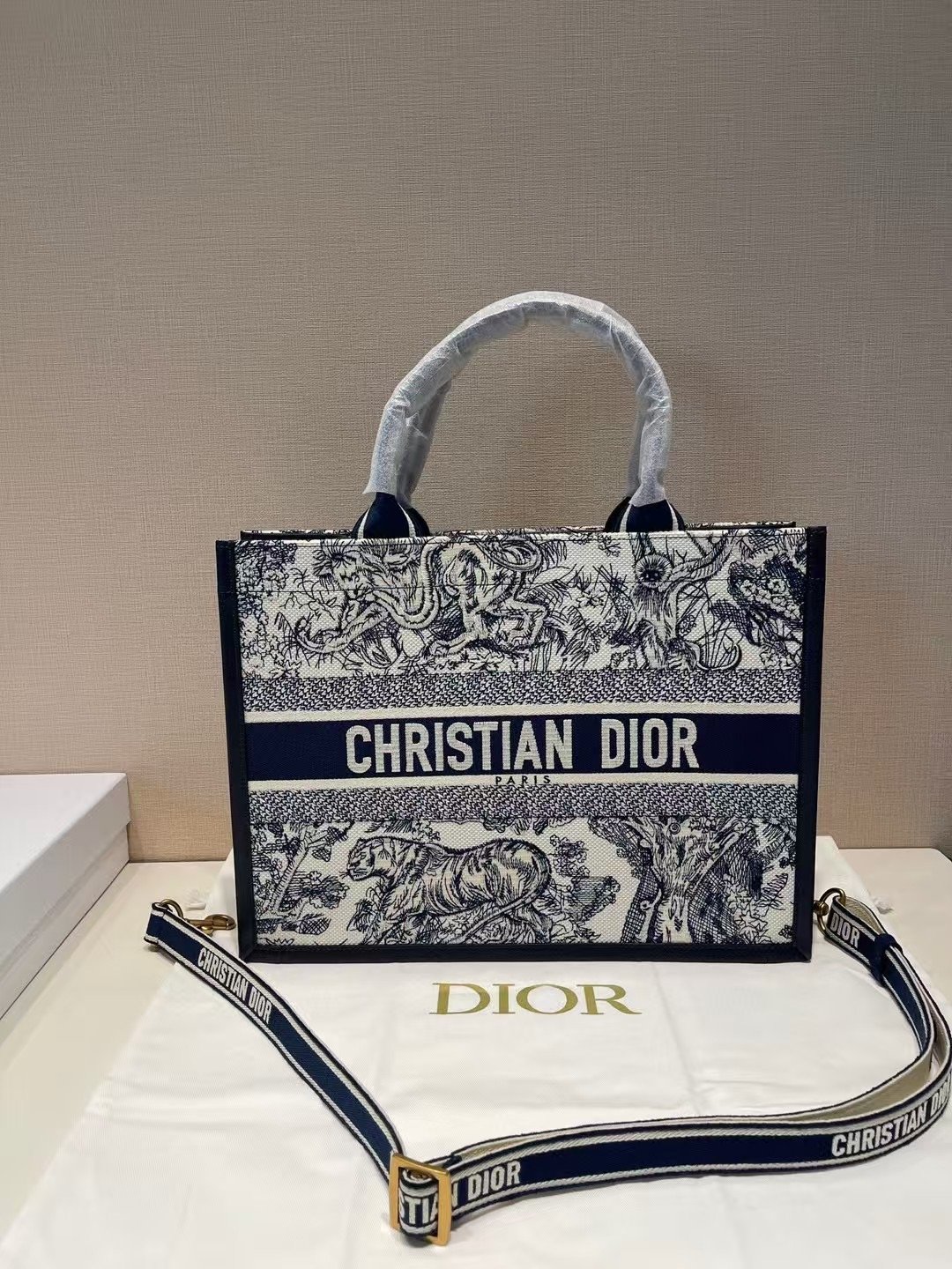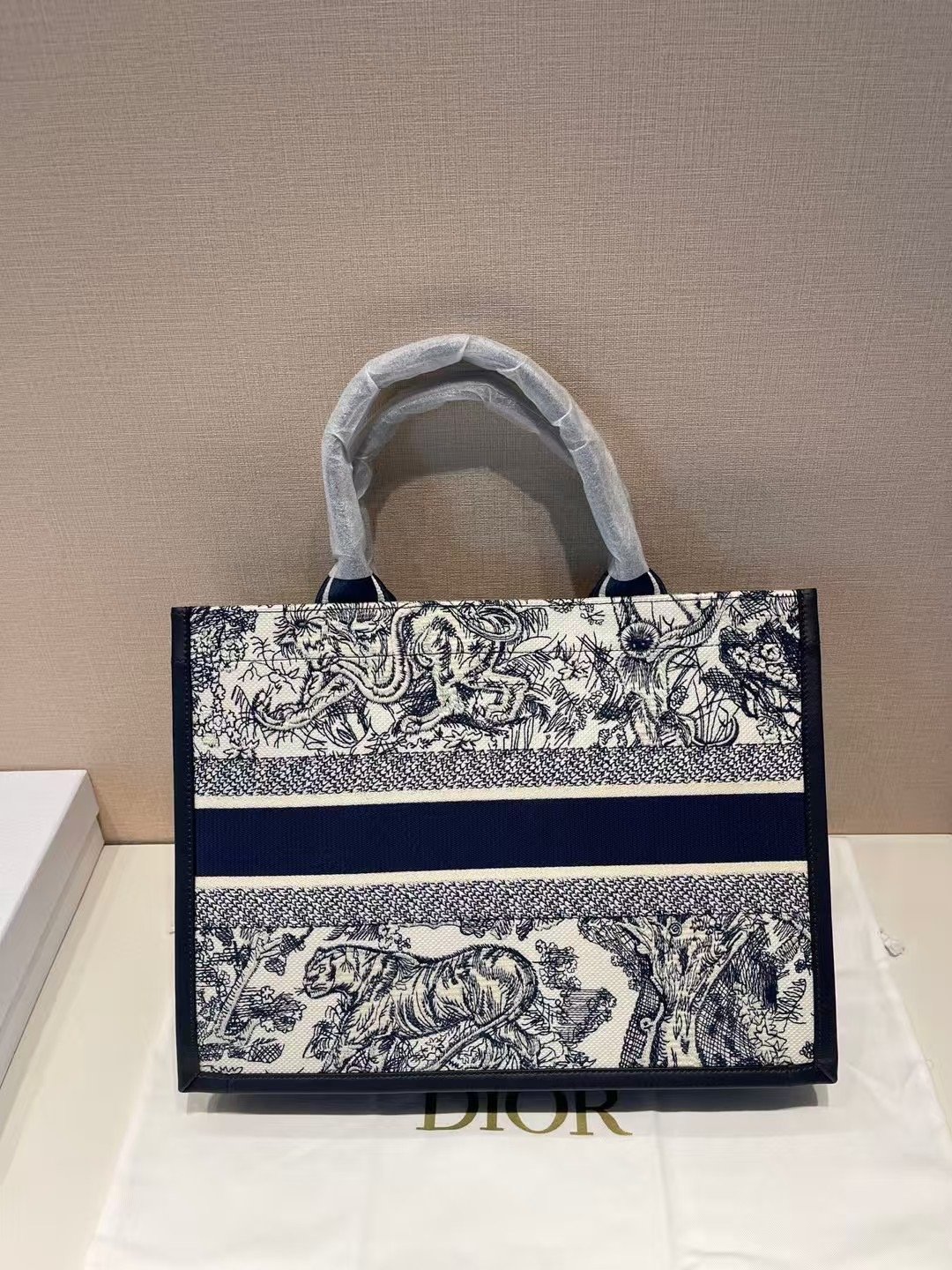 This is a Christian Dior tote bag featuring a toile de Jouy pattern with tigers and nature motifs, the brand’s signature “CHRISTIAN DIOR PARIS” stripe, and structured handles. It sits on a Dior-branded dust bag, embodying the brand’s luxury and artistic design