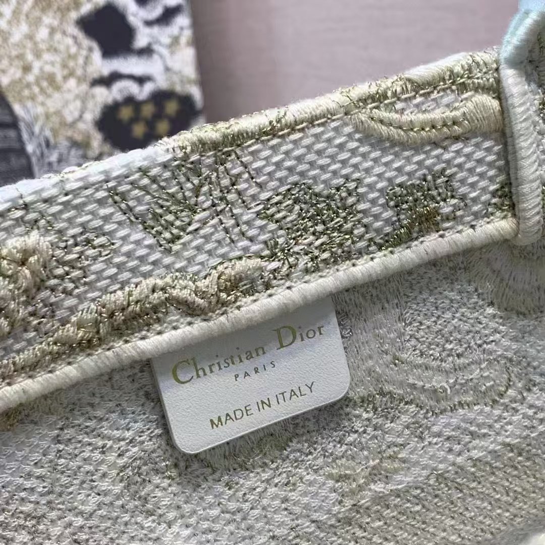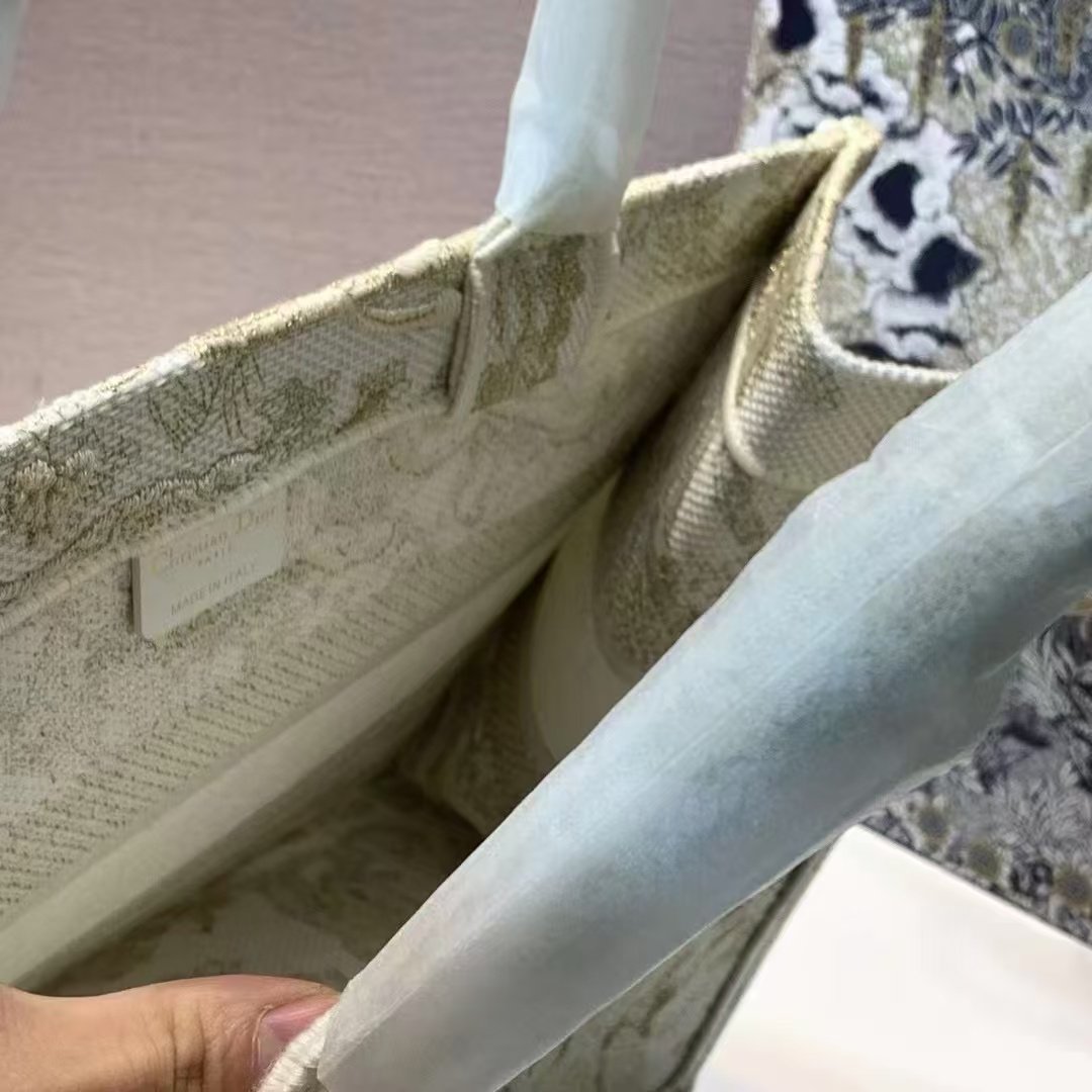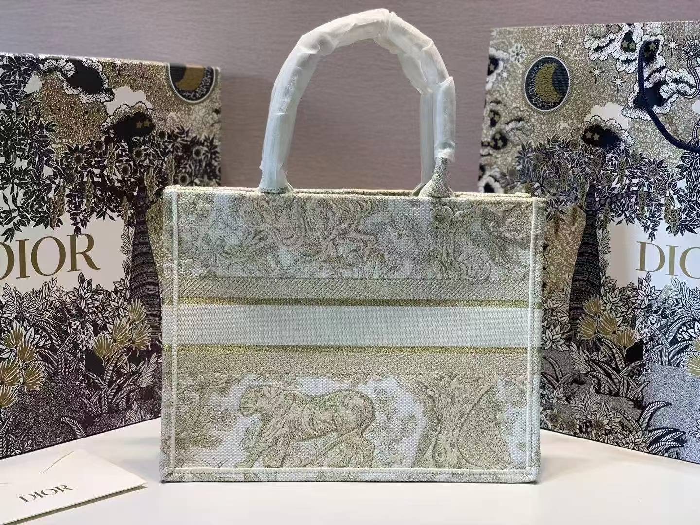 This is a Christian Dior tote bag featuring an intricate embroidered design with animal and nature motifs, the “CHRISTIAN DIOR PARIS” logo, a structured top handle, and a star-shaped charm. Presented with Dior’s artistic packaging, it embodies the brand’s blend of luxury craftsmanship and whimsical design.