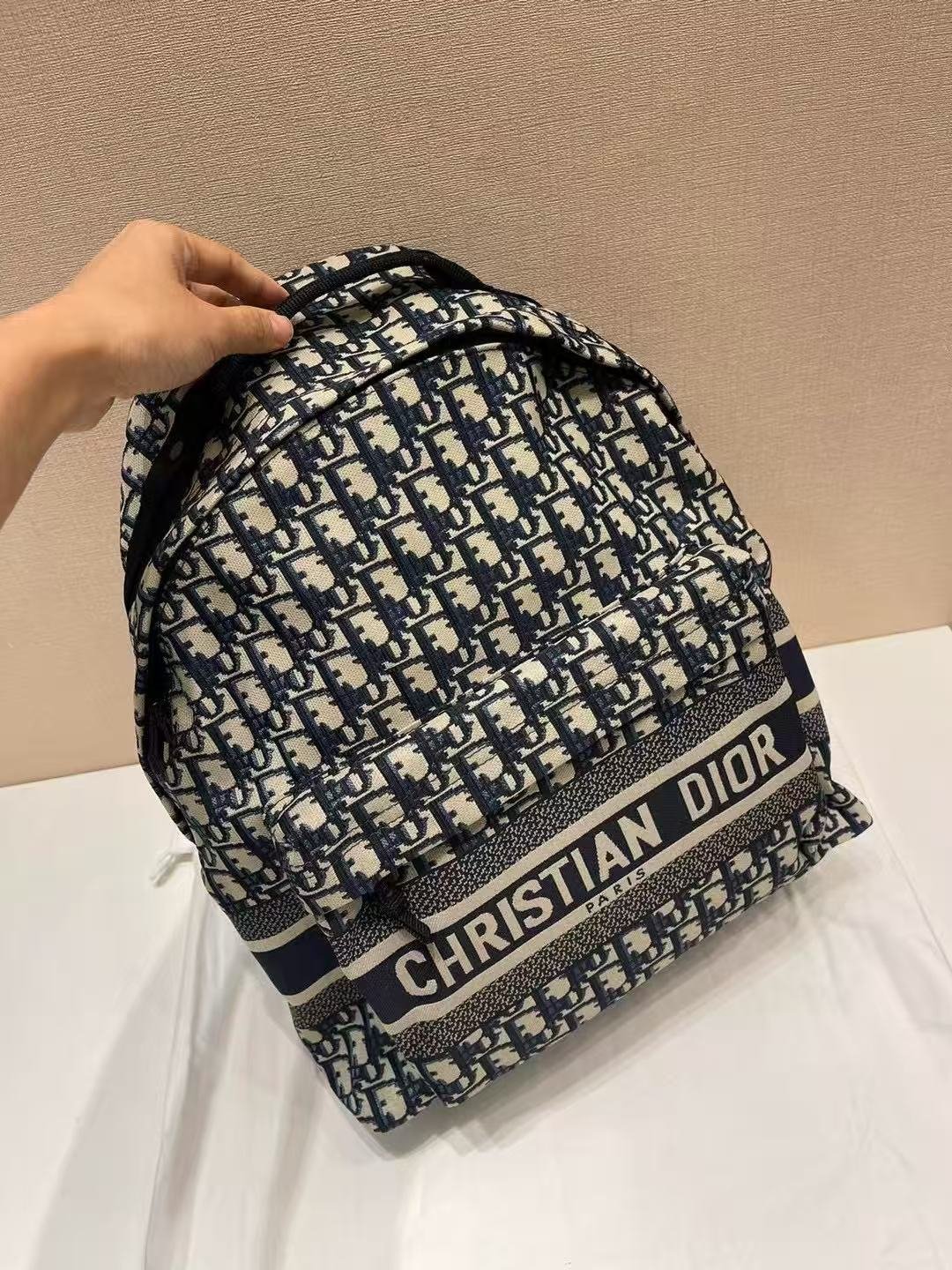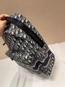 Diro Backpack This is a Christian Dior backpack featuring the iconic Dior Oblique pattern in navy and beige. It has a front pocket with the bold “CHRISTIAN DIOR PARIS” branding, embodying the brand’s signature luxury and casual style. Contact by email:qiling0251014@gmali.com