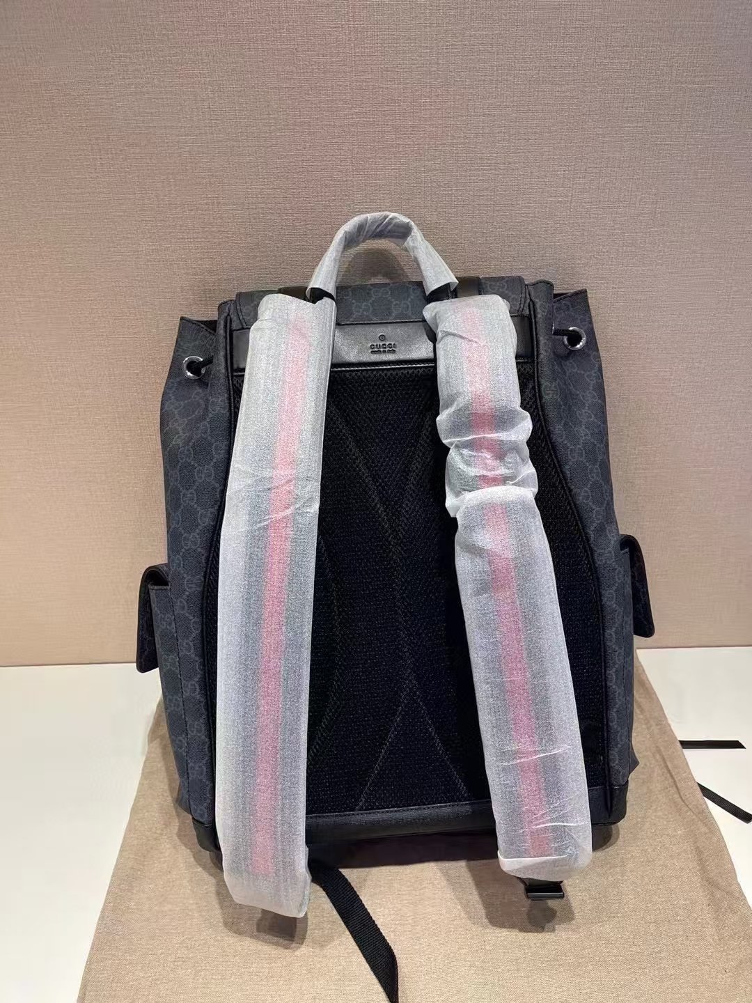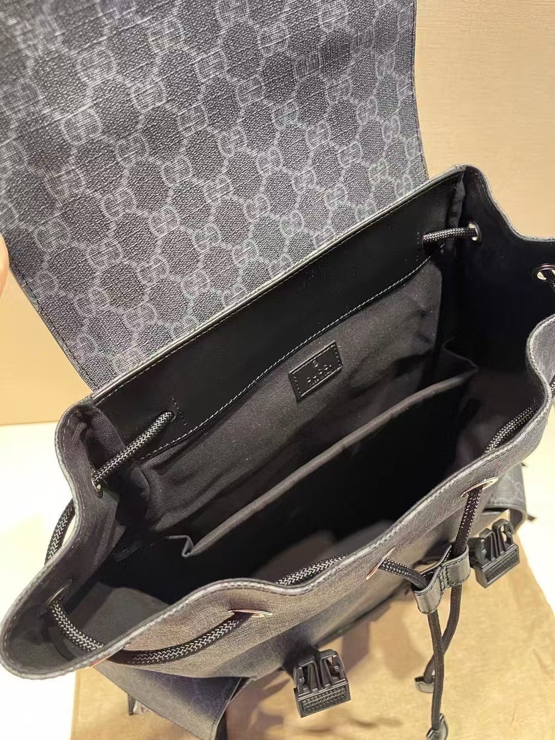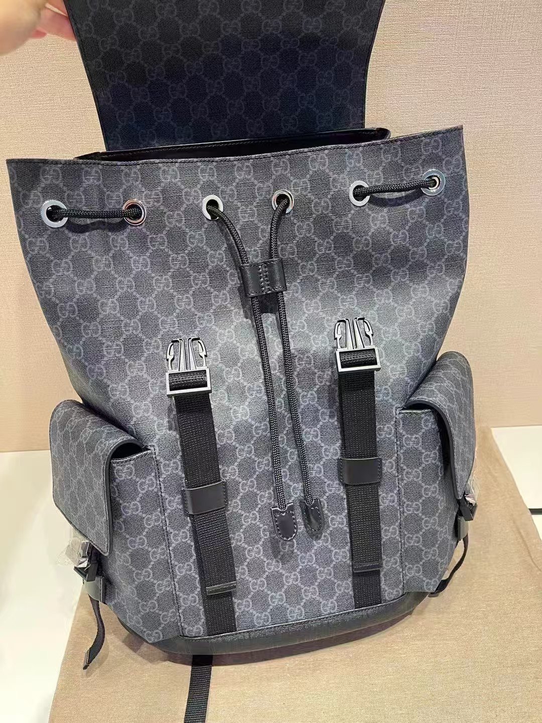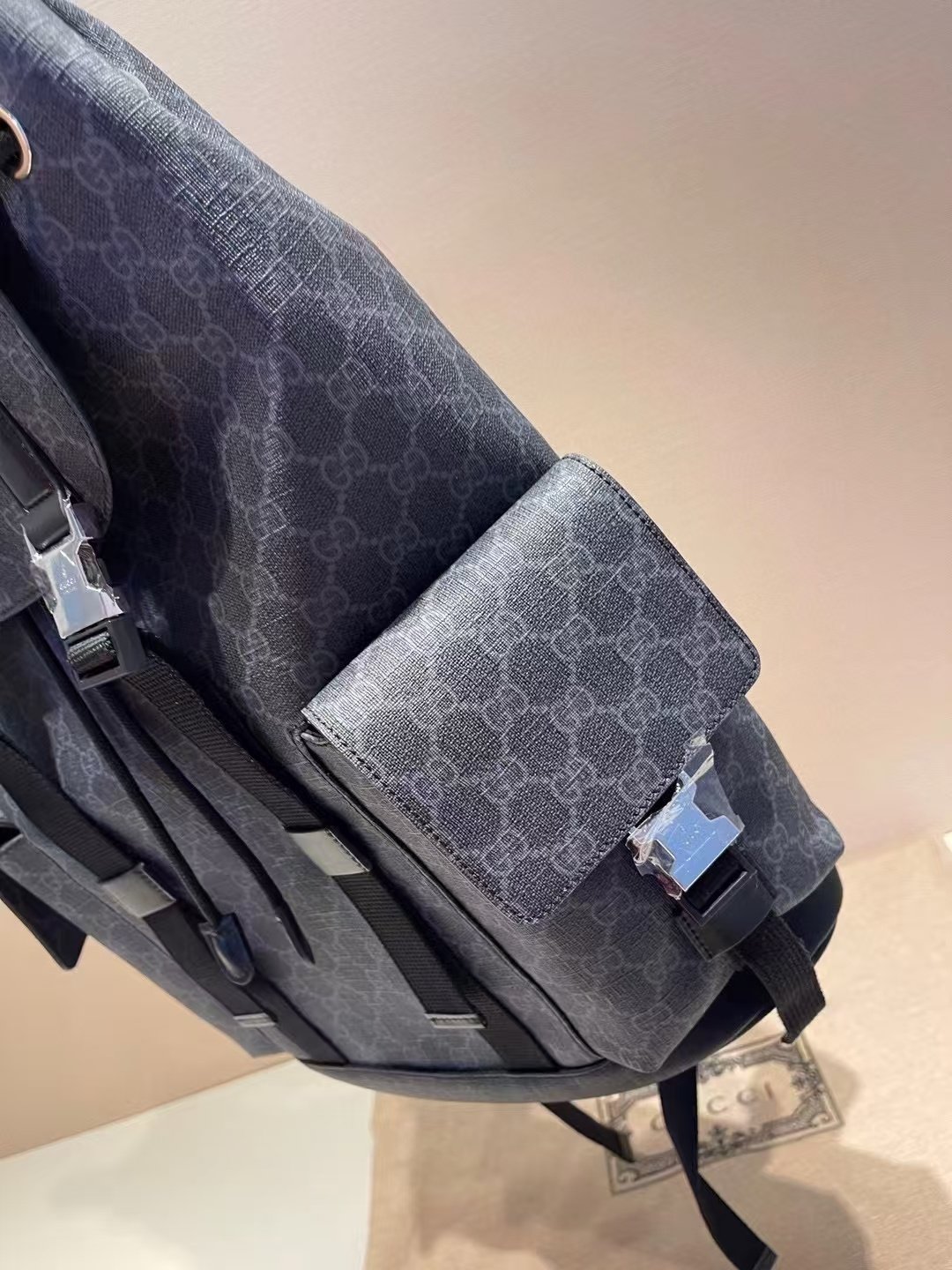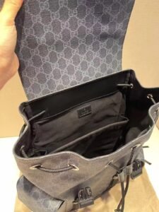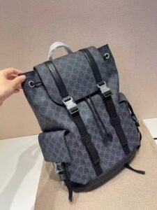 This is a Gucci backpack in the GG monogram canvas with a dark gray hue, featuring black leather accents, multiple buckle details, front pockets, and a top handle. It embodies the brand’s blend of luxury and functional design, suitable for both style and practicality.