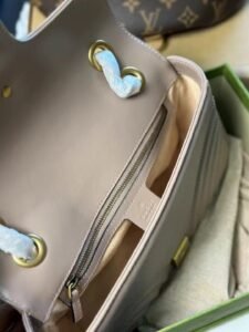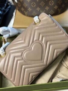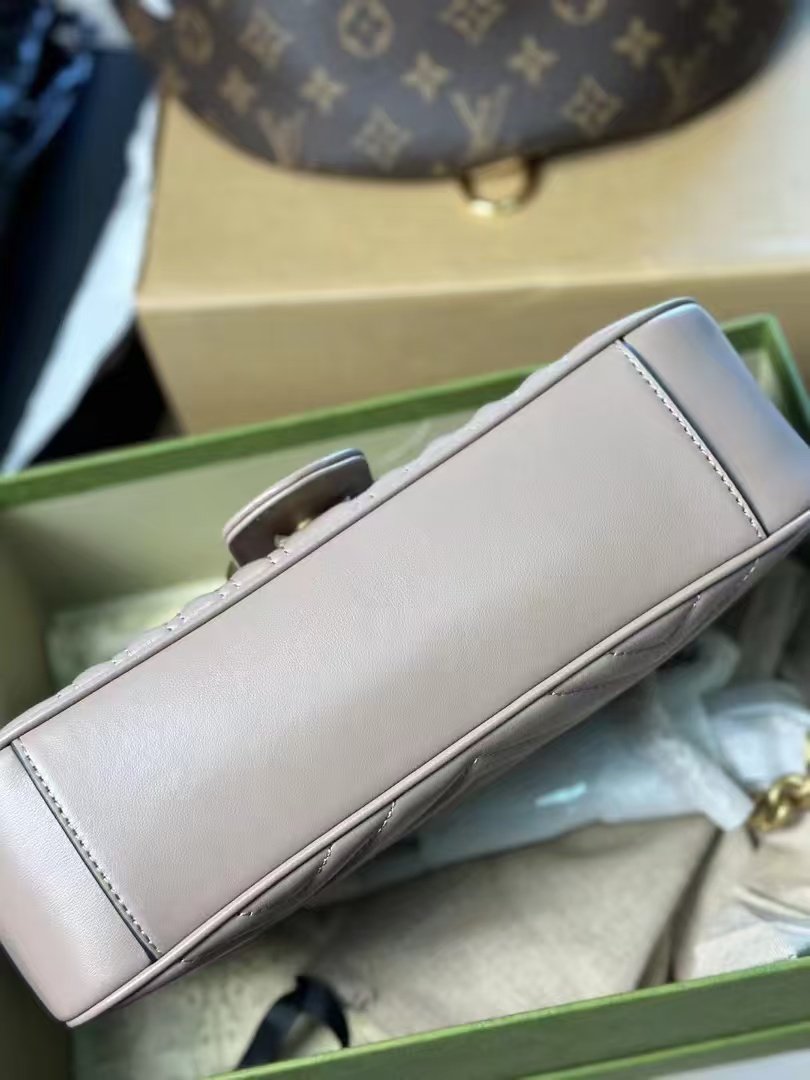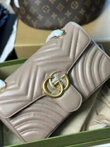 This is a GUCCI Marmont GG bag, crafted from quilted leather in a soft taupe hue, featuring the iconic gold-tone interlocking GG logo clasp. Designed with a chain strap for versatile shoulder or crossbody styling, it embodies the brand’s luxurious craftsmanship and timeless, elegant aesthetic.