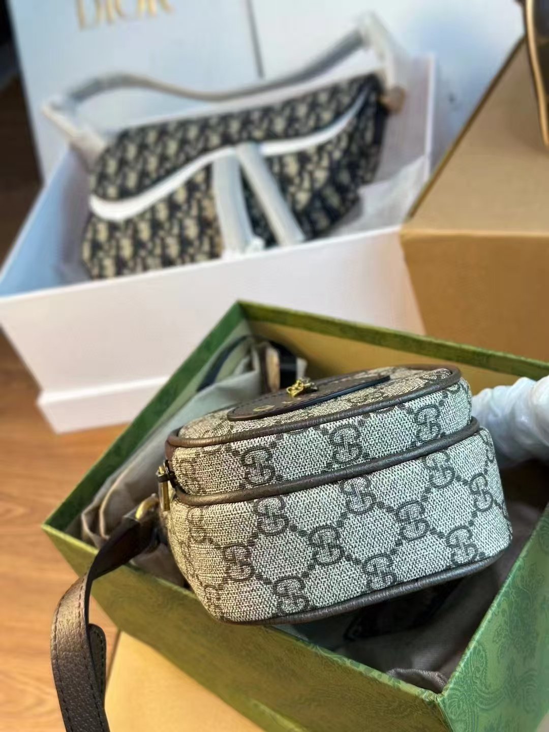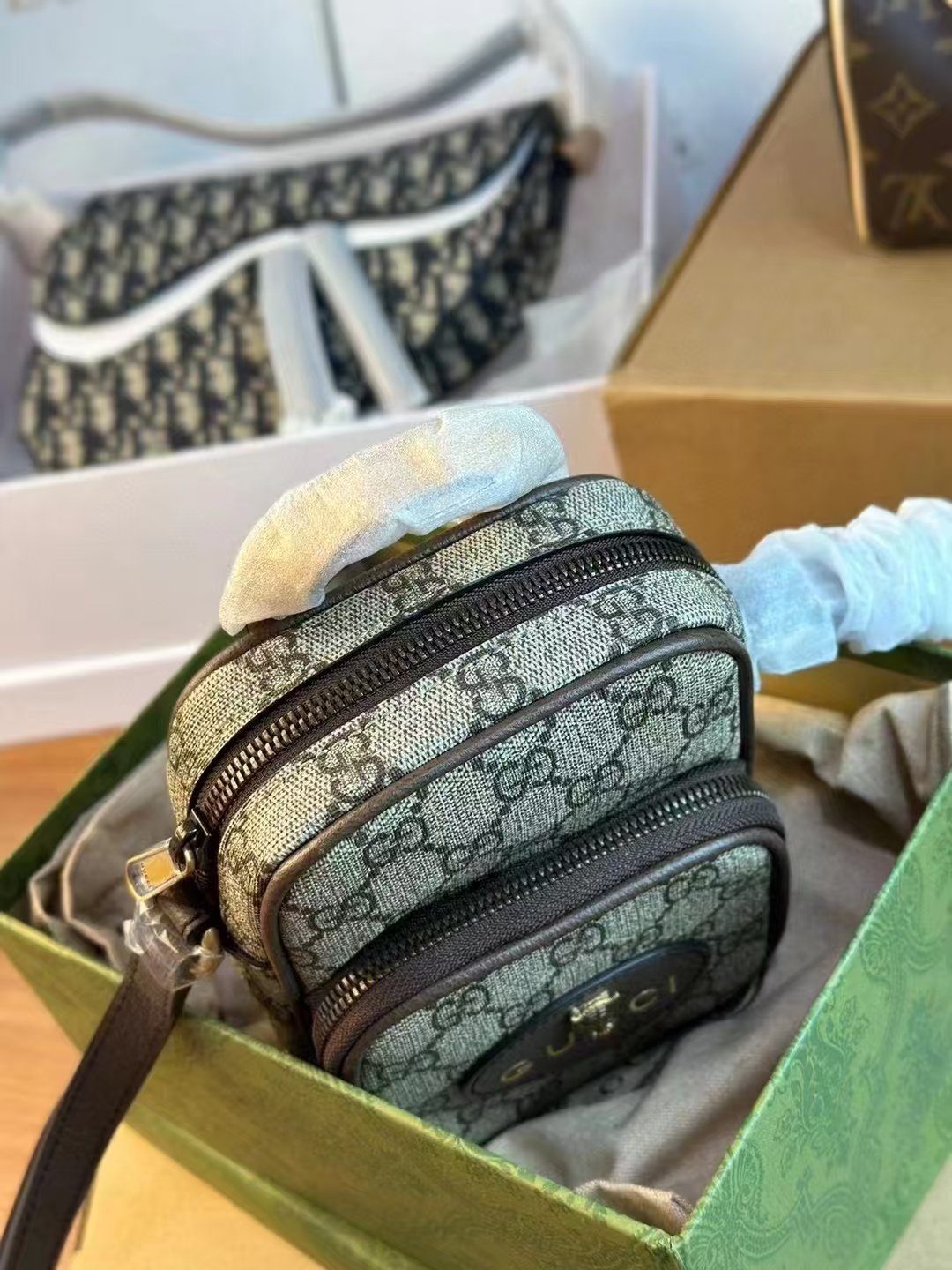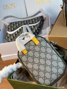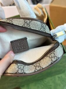 This is a GUCCI Neo Vintage mini bag, featuring the iconic GG Monogram print on canvas with leather trim, a gold-tone tiger-head detail, and the embossed “GUCCI” logo. It comes with a strap for versatile crossbody styling, embodying the brand’s retro-chic luxury and playful, compact design.