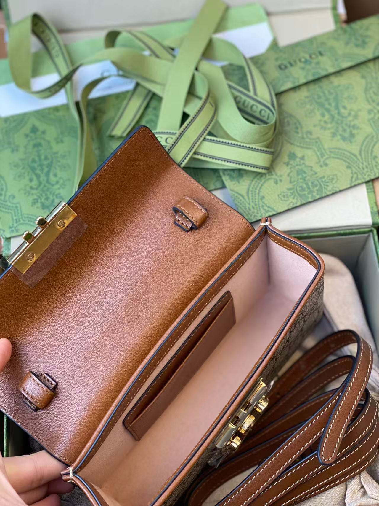 This is a GUCCI Padlock bag, crafted from GG-patterned canvas with leather trim, featuring signature gold-tone hardware (including the iconic padlock closure) and a structured box silhouette. It comes with a detachable strap for versatile styling (handheld, shoulder, or crossbody), embodying the brand’s classic luxury and elegant, functional design.