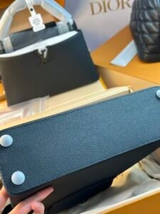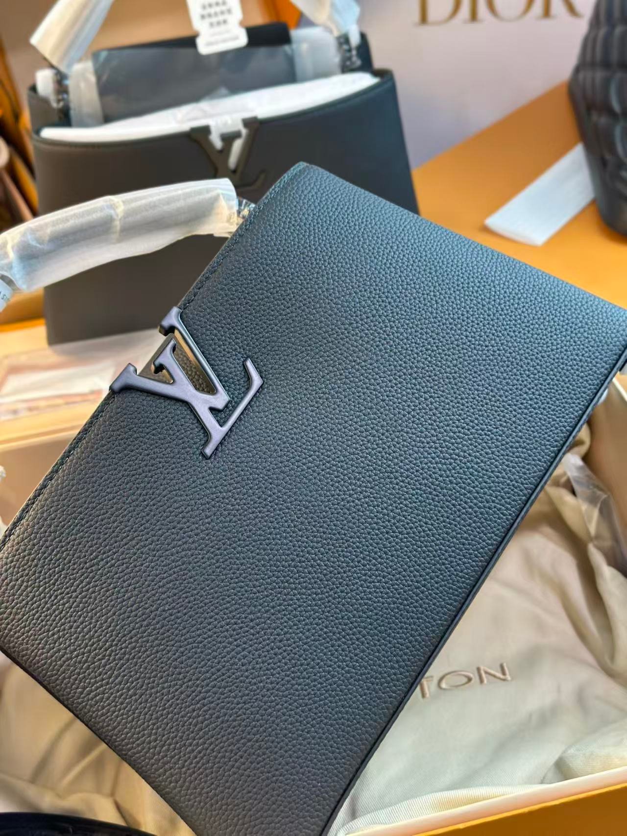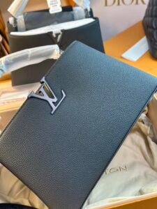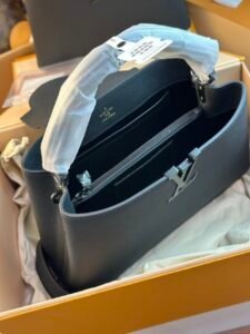 This is a Louis Vuitton Capucines East West bag, crafted from matte calfskin, featuring a detachable and adjustable strap, and versatile styling as a handbag, shoulder, or crossbody bag. It embodies the brand’s luxury craftsmanship and timeless design with the iconic LV hardware detail.