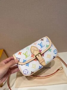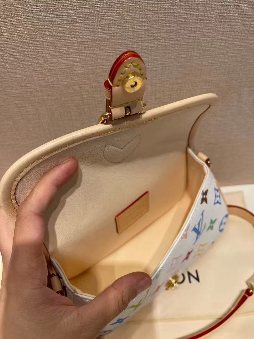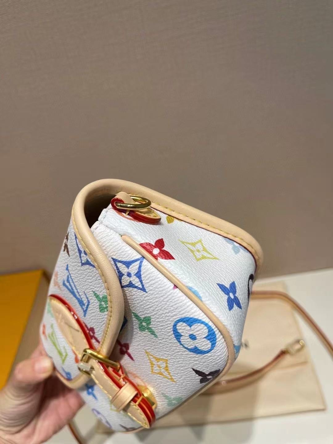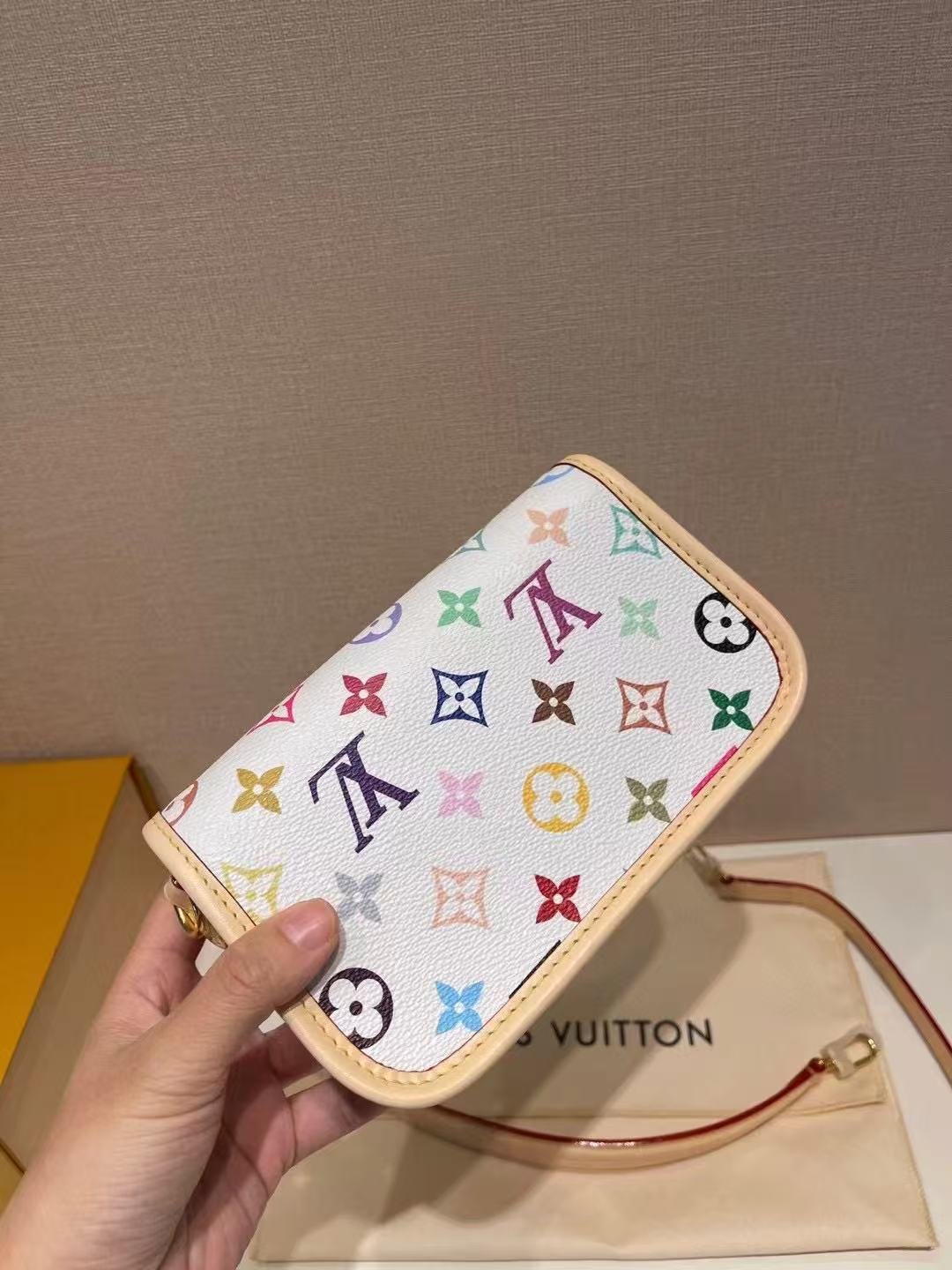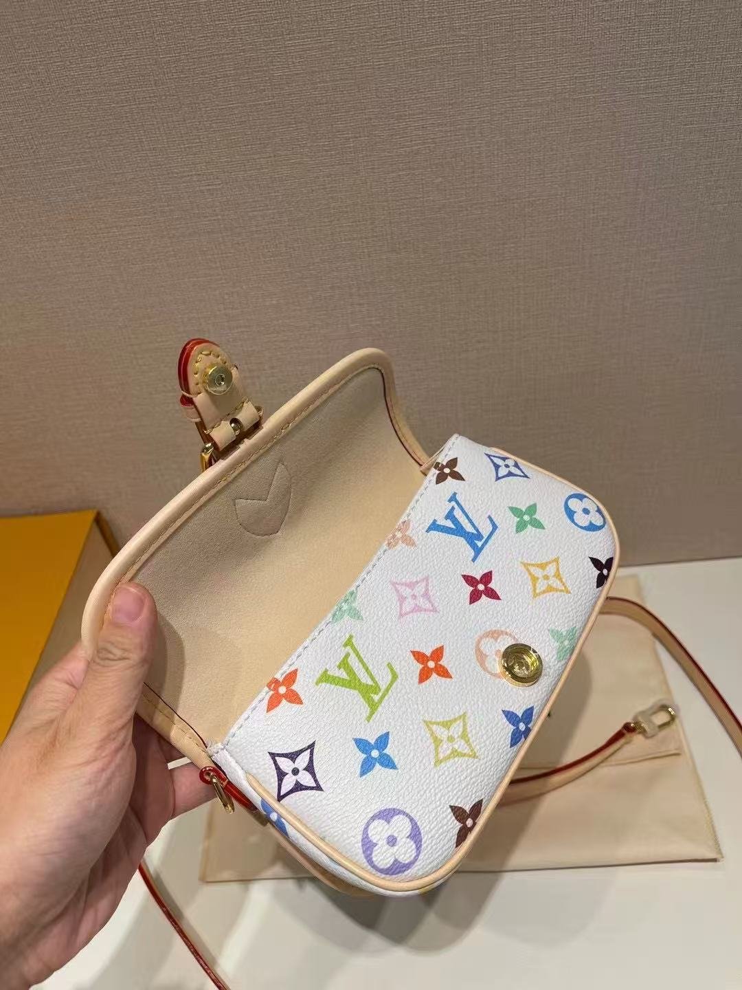 This is a Louis Vuitton Diane nano bag from the collaboration with Takashi Murakami, featuring the iconic white Multicolor Monogram print, a magnetic closure with metal hardware, calfskin trim, and an adjustable strap. Crafted from coated canvas, it embodies the fusion of LV’s luxury heritage and Murakami’s vibrant art, offering versatile styling as a handbag or crossbody.
