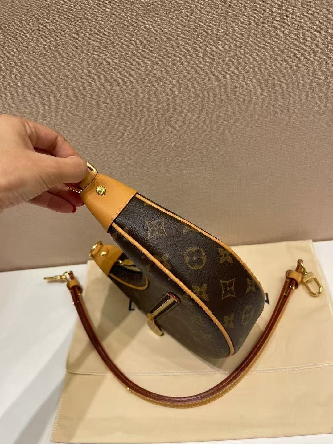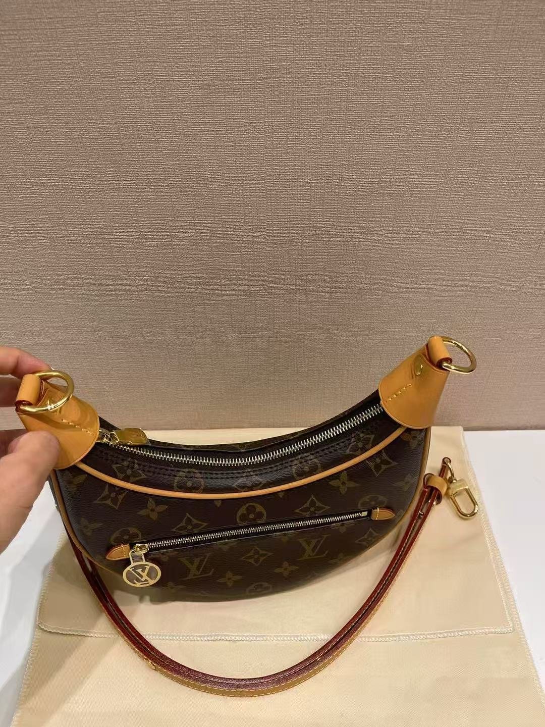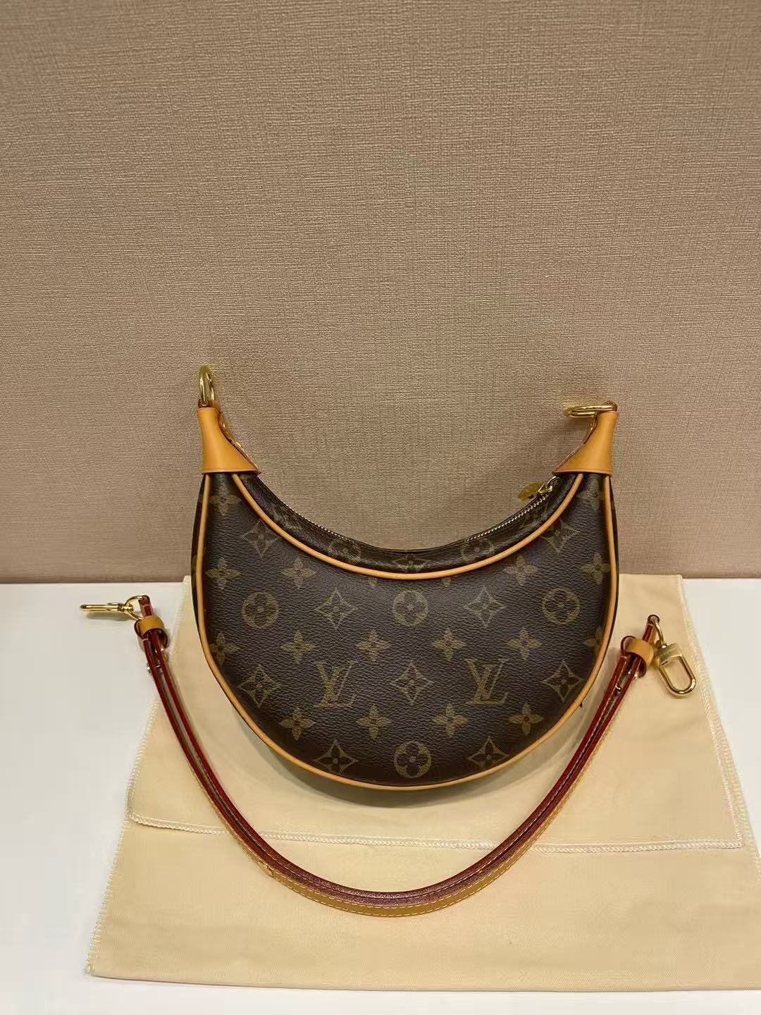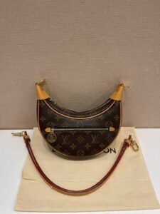 This is a Louis Vuitton Loop bag in the classic Monogram canvas, featuring a crescent (moon-shaped) silhouette, calfskin trim, and an adjustable chain strap. It embodies the brand’s timeless design, offering versatile styling as an underarm bag, handbag, or crossbody, crafted from coated canvas for durability and luxury.