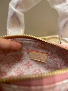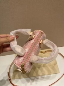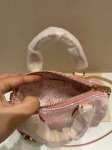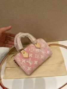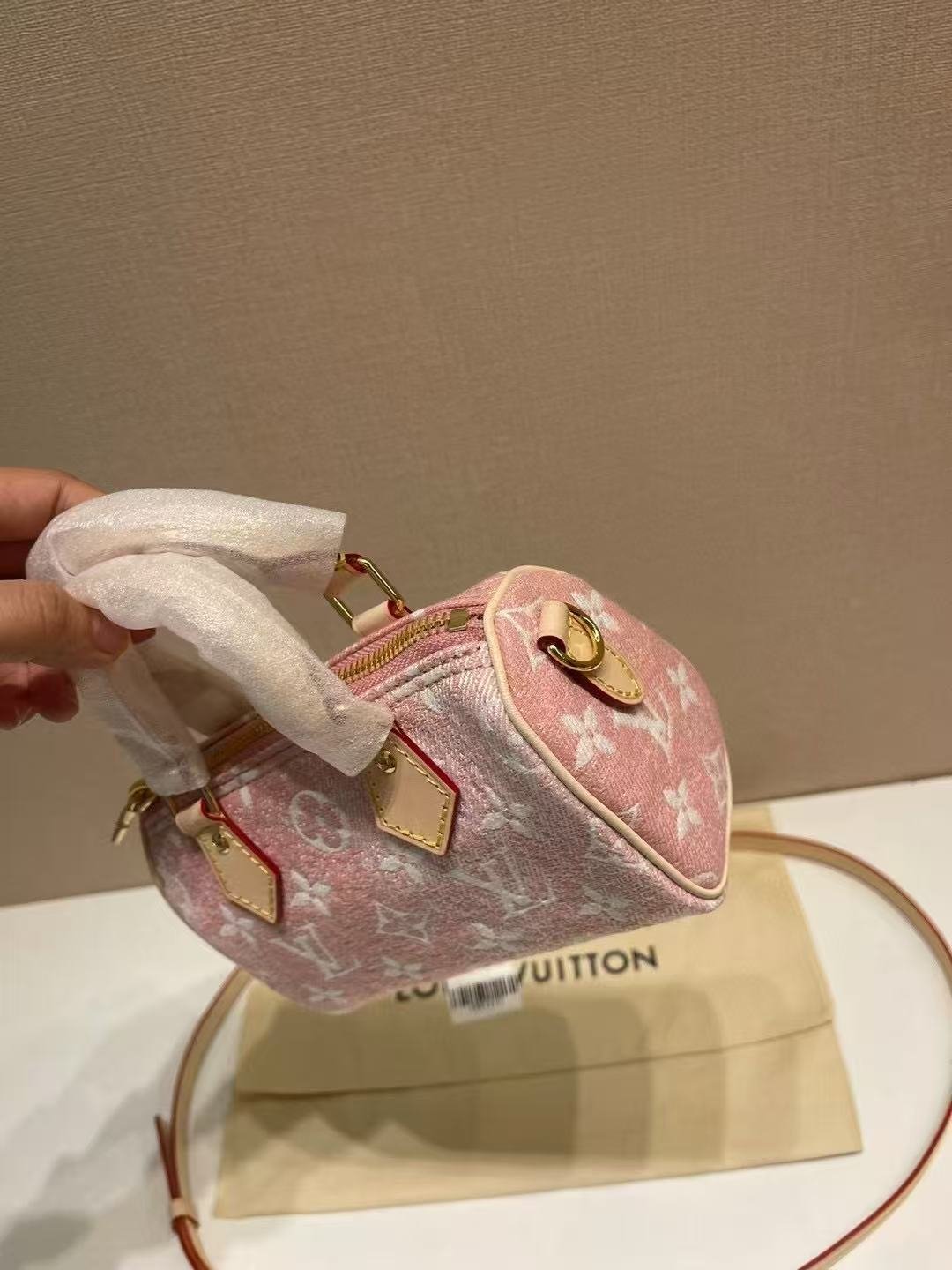 This is a Louis Vuitton Nano Speedy bag in pink denim with the iconic LV Monogram pattern. It features a top handle, an adjustable crossbody strap, and sits on a LV dust bag, combining classic design with a playful pink hue.
