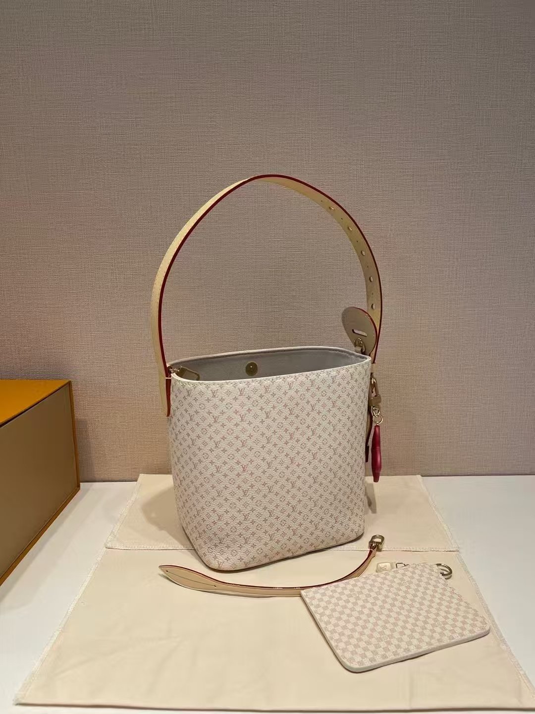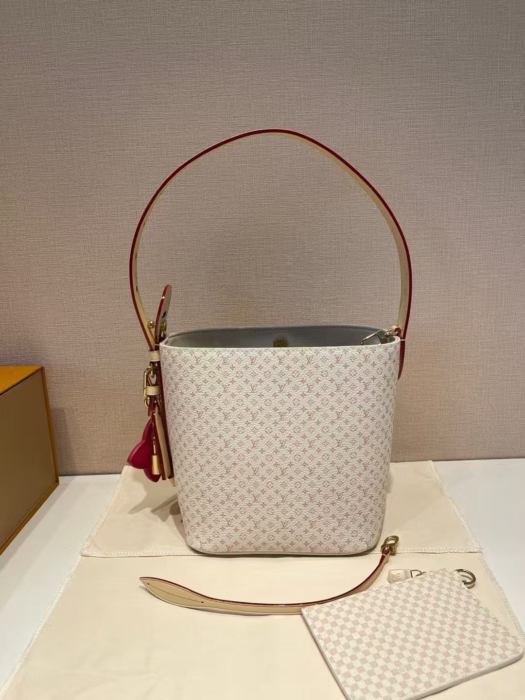 This is a Louis Vuitton bucket bag set in a light pink Monogram canvas, featuring a structured silhouette, a detachable pouch, an adjustable strap, and a decorative charm. Presented with LV’s signature packaging, it embodies the brand’s blend of timeless design and feminine elegance.
