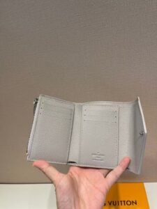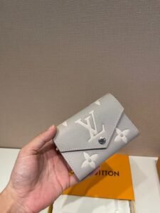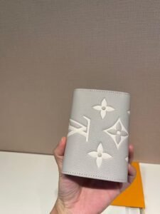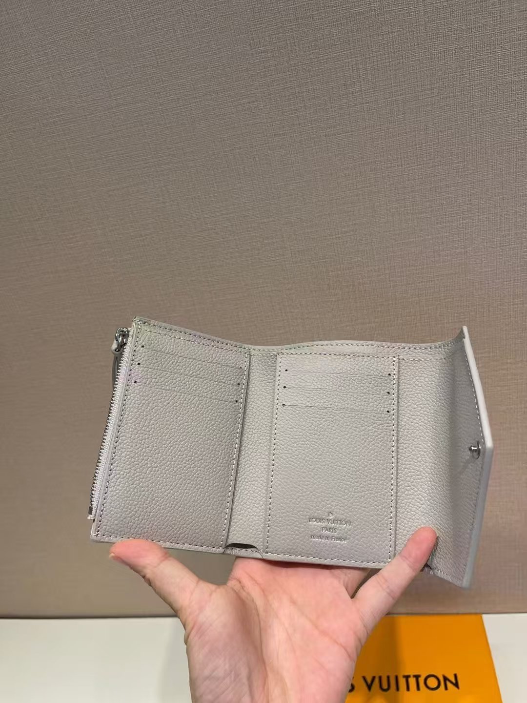 This is a Louis Vuitton wallet in light gray leather, featuring the iconic white LV monogram and flower motifs. It has an envelope-style design with a snap closure, presented in the brand’s signature orange box, embodying luxury and classic craftsmanship.