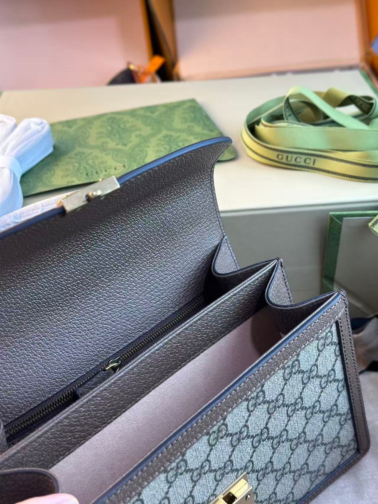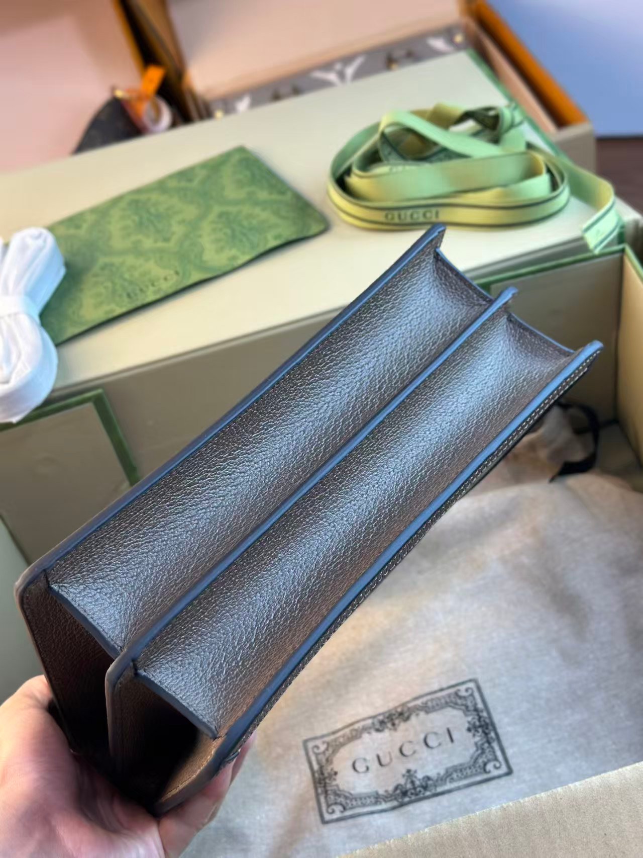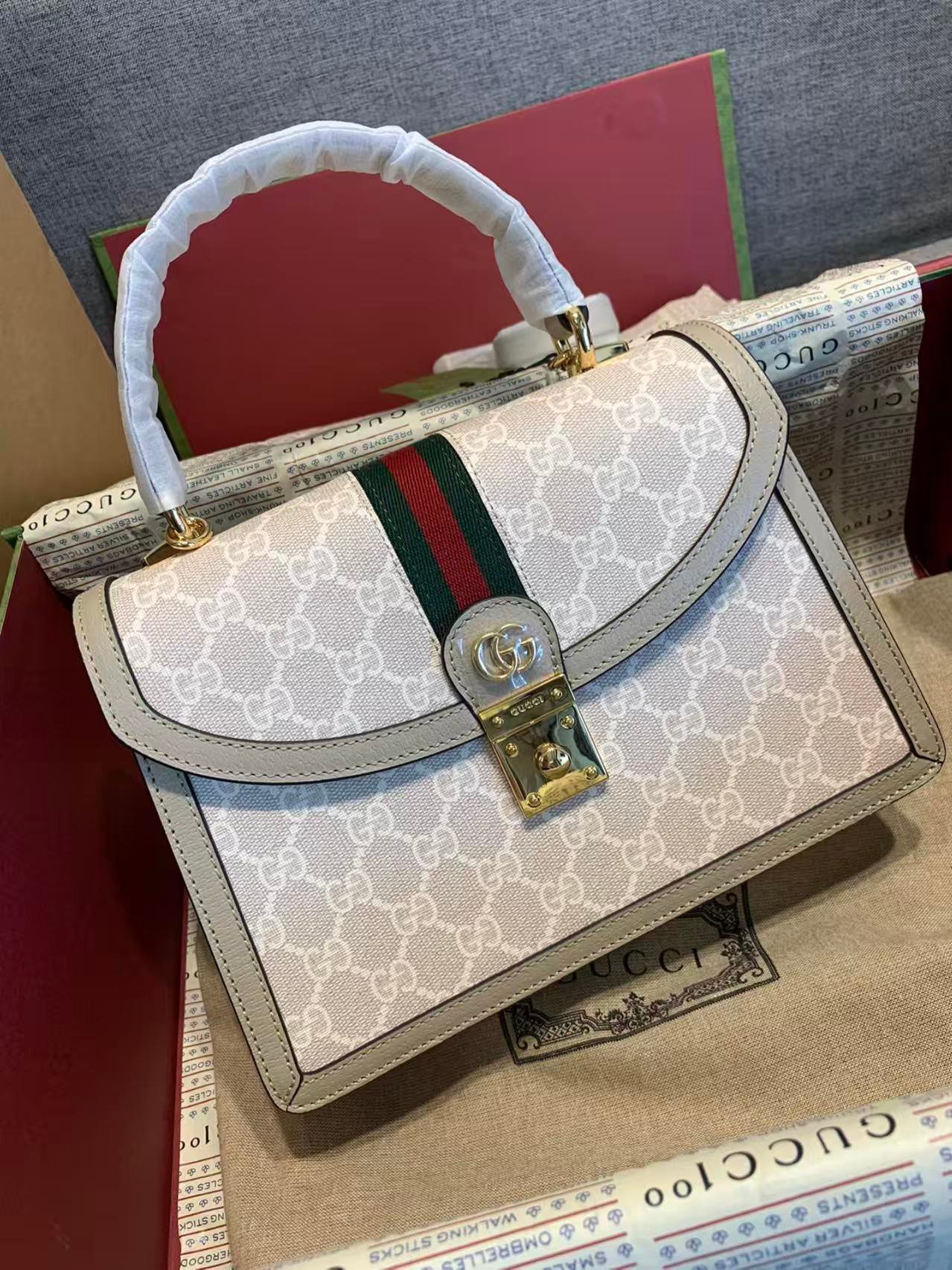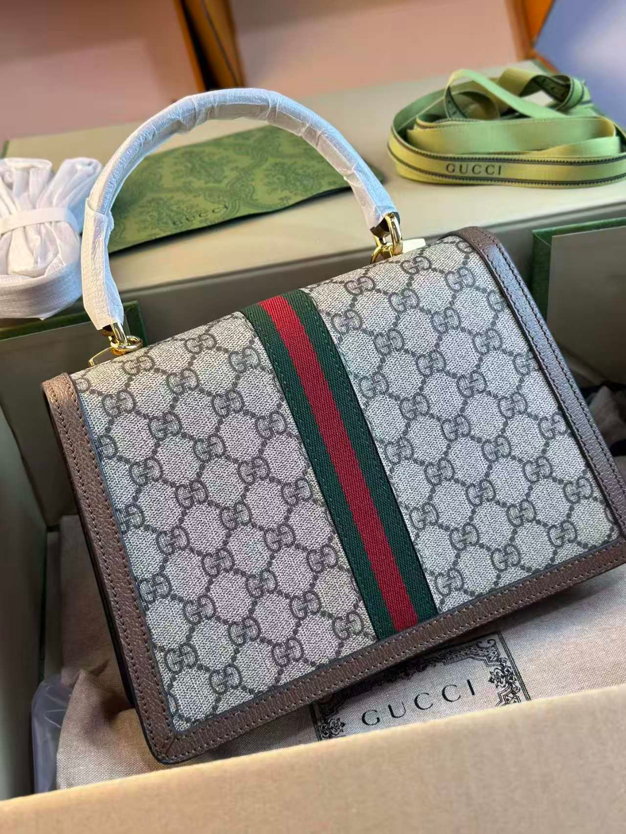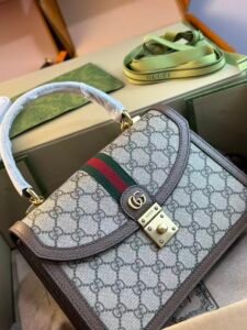 This is a Gucci handbag in the signature GG monogram canvas, featuring the iconic red-green web stripe, a gold-tone GG lock, and a top handle. Presented with Gucci’s green accessories and dust bag, it embodies the brand’s heritage and luxury craftsmanship.