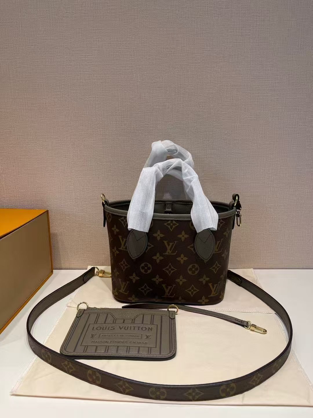 This is a Louis Vuitton Neverfull bag set in the classic Monogram canvas, featuring a structured tote bag, a matching pouch, and an adjustable crossbody strap. It embodies the brand’s timeless design and functional versatility, ideal for everyday use.