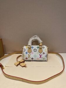 This is a Louis Vuitton Nano Speedy bag in white Multicolor Monogram canvas, featuring colorful LV motifs, a top handle, and an adjustable crossbody strap. It comes with a bow charm and sits on a LV dust bag, blending iconic design with playful vibrancy.
