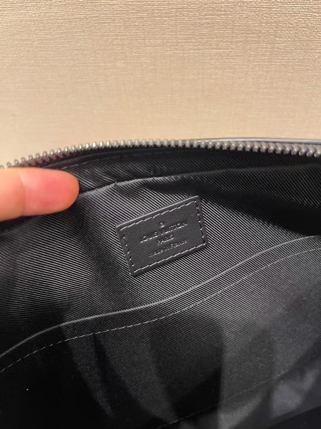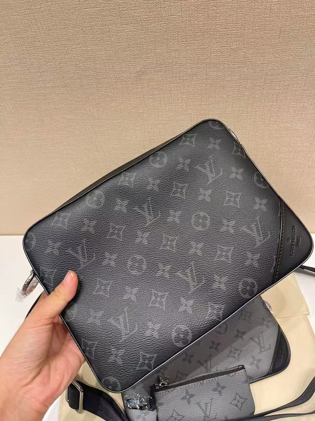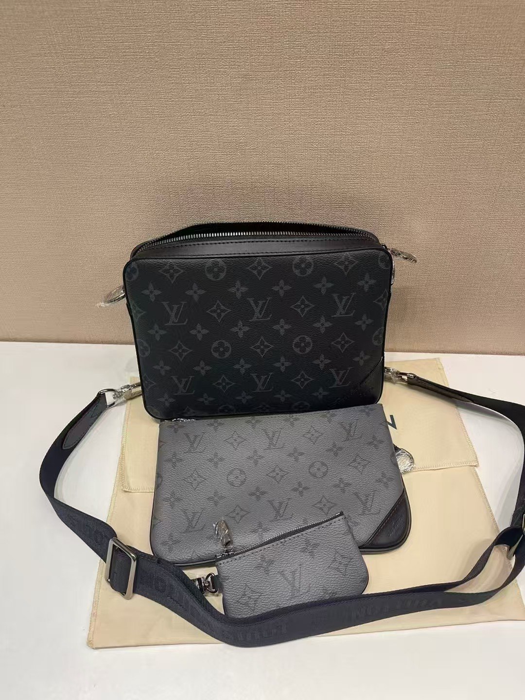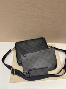 This is a Louis Vuitton crossbody bag set featuring the Monogram pattern in a black and gray color scheme. It includes a main bag with an adjustable strap and a matching small pouch, embodying the brand’s luxury and functional design for everyday use.