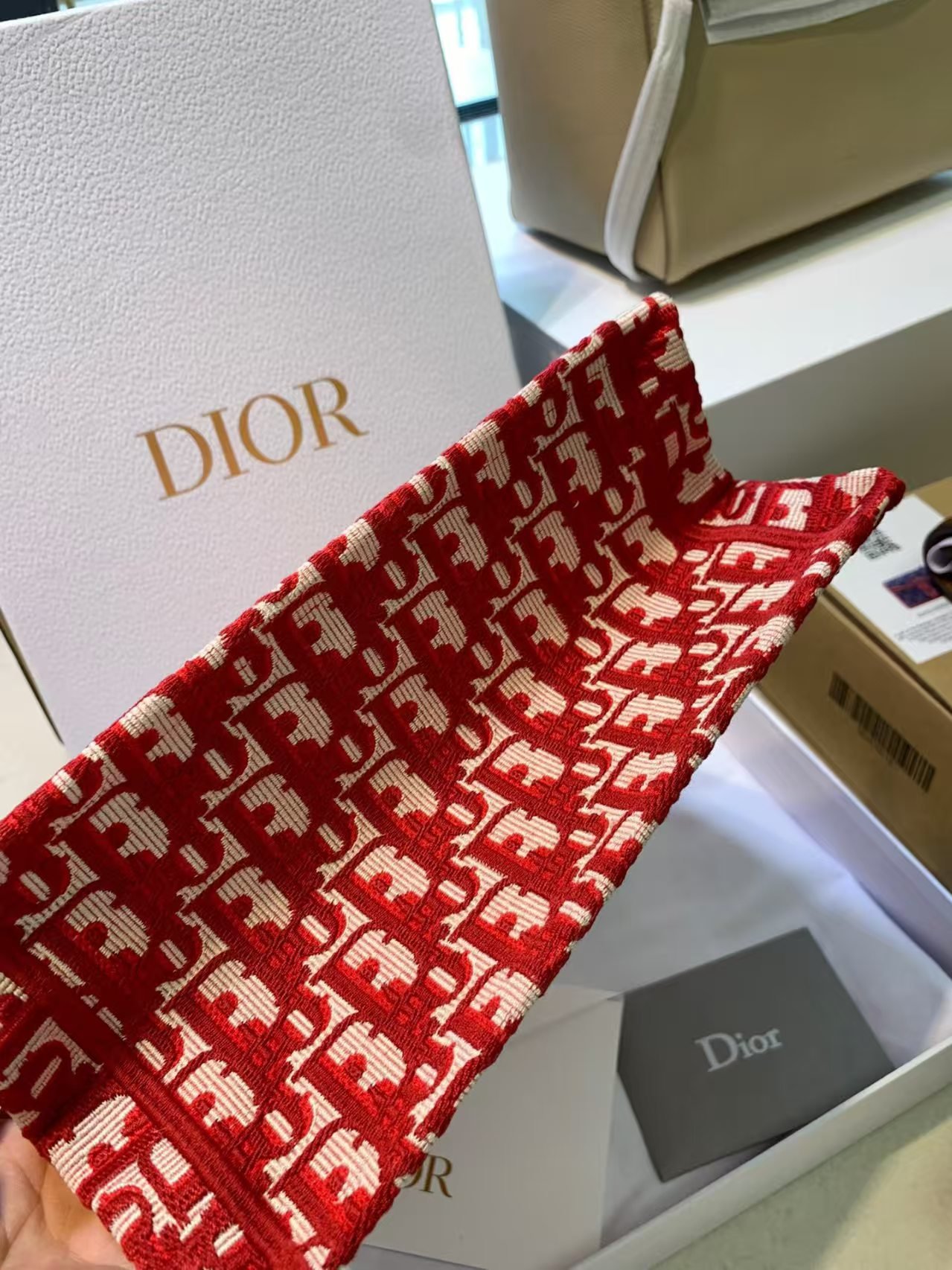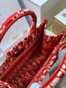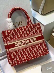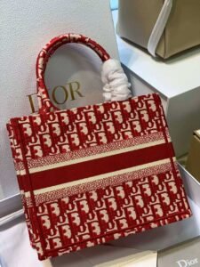 This is the DIOR BookTote in wine red, crafted from canvas featuring the iconic all-over Oblique monogram embroidery (in red and cream tones), plus the bold “CHRISTIAN DIOR PARIS” stripe detail. It has top handles (with a protective cover) and supports handheld or shoulder carry (often with a detachable strap). A vibrant, stylish tote that blends classic branding with a striking wine-red hue, perfect for adding a pop of color to daily looks.