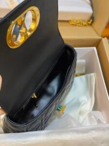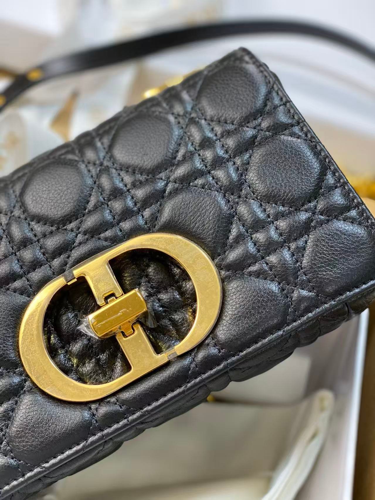 This is the DIOR Caro bag, crafted from soft black calfskin with the iconic cannage (quilted lattice) stitching. It features a polished gold-tone “CD” clasp and comes with a strap, supporting shoulder or crossbody carry. A sleek, elegant luxury piece with a soft silhouette, blending classic detailing with versatile, everyday functionality
