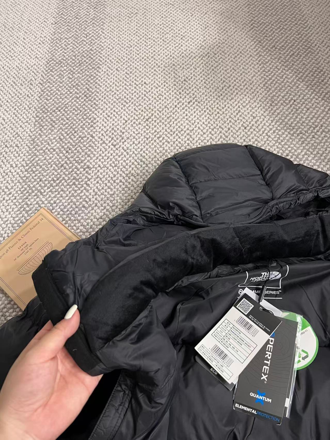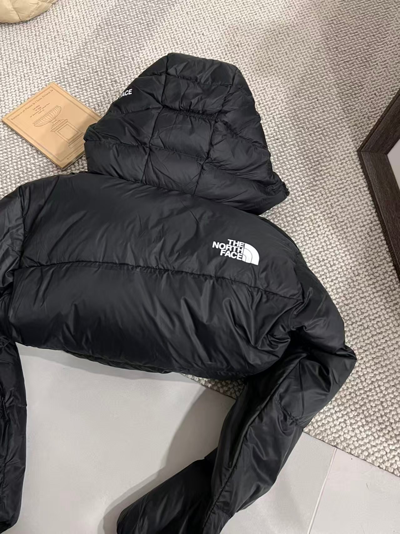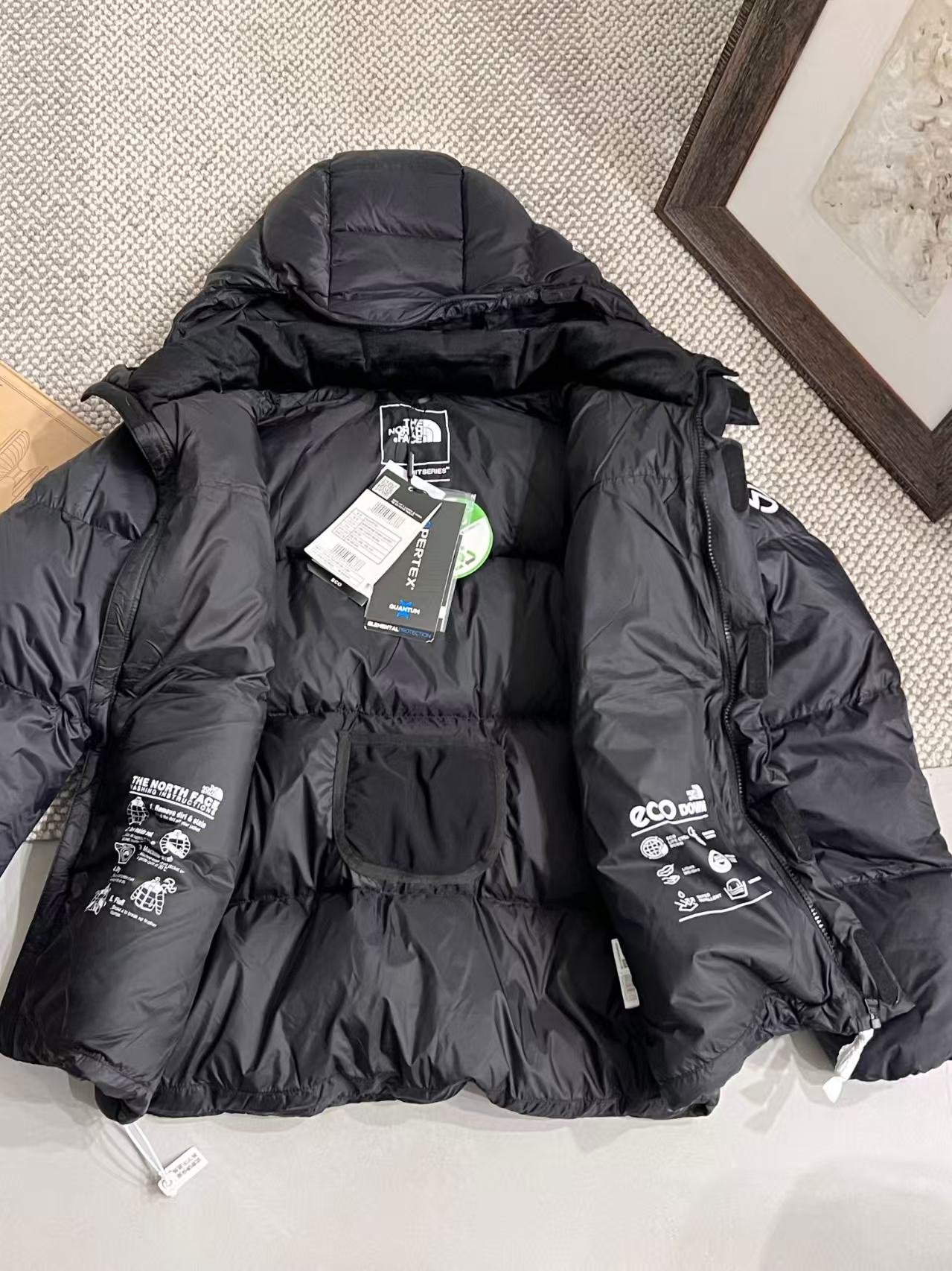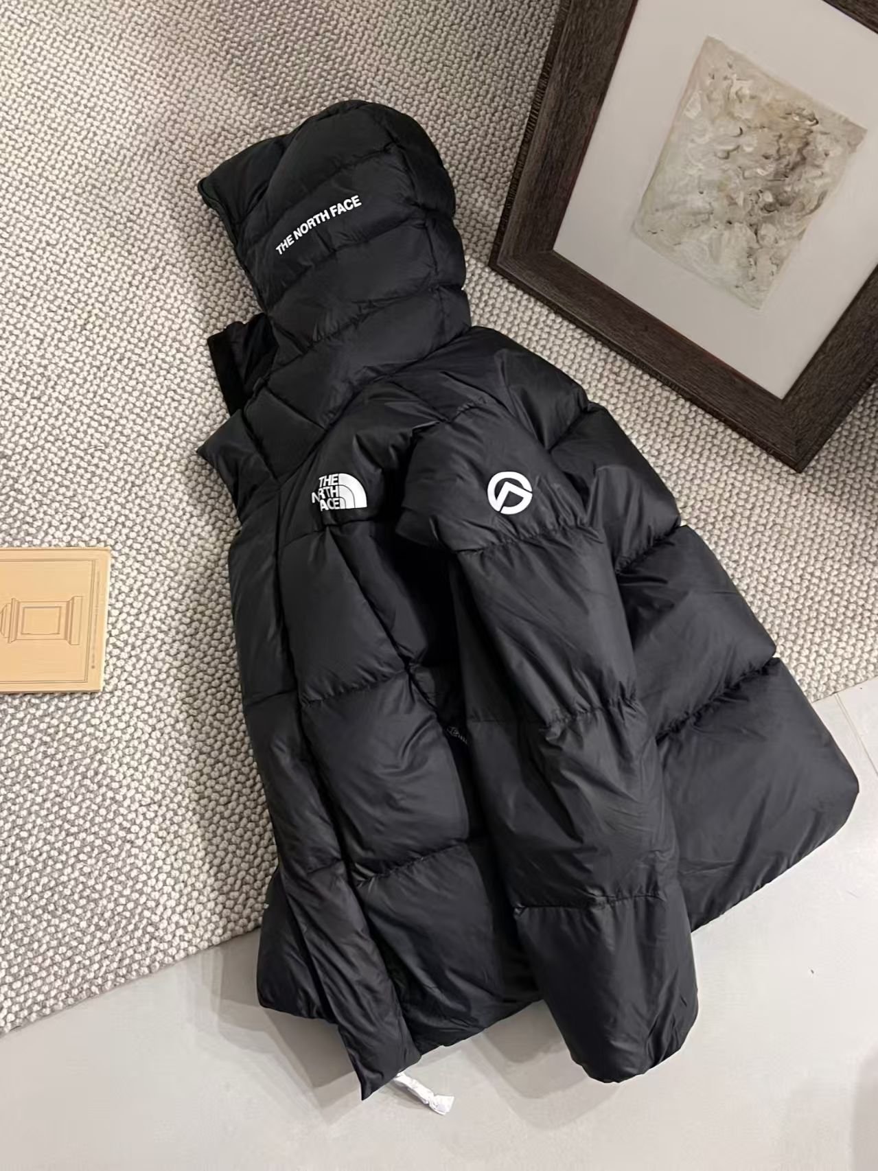 This is a black down jacket from The North Face, featuring a hood, the brand’s iconic white logo, multiple zippered pockets, and Gore-Tex detailing. It embodies the brand’s functional design and durability, ideal for cold-weather outdoor activities.